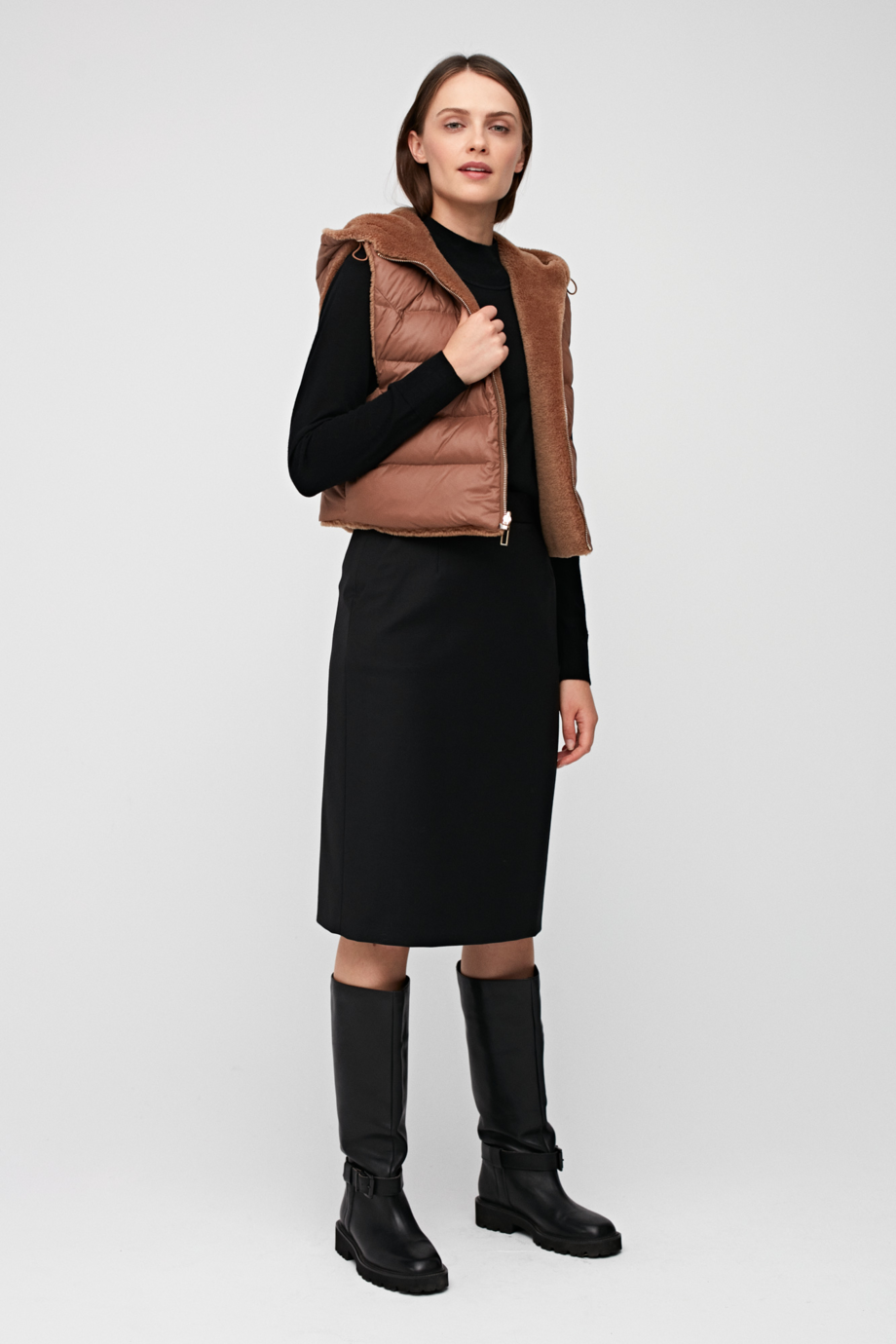 Do ołówkowej spódnicy z wełną dziewiczą możesz założyć krótszą bluzkę, którą wpuścisz do wewnątrz lub koszulę przekraczającą linię talii, która świetnie będzie się prezentować noszona w wersji na wierzch. Model został tak skonstruowany, aby zapewnić optymalną wygodę noszenia ubrania przy zachowaniu jego nieskazitelnego kształtu. Do kompletu polecamy czarny żakiet z tej samej tkaniny.