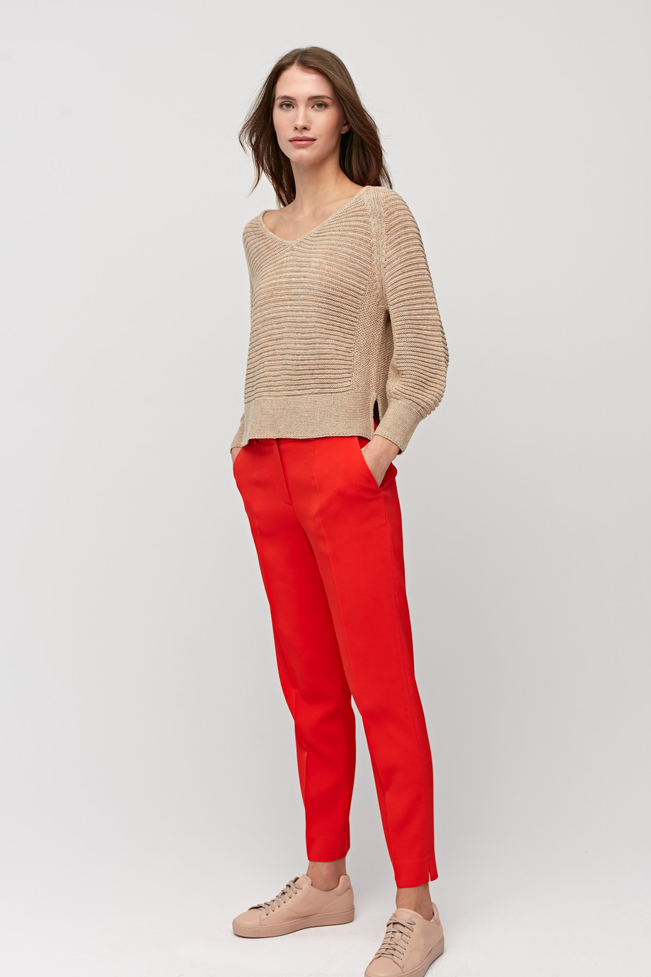 Damskie spodnie z wysokim stanem to propozycja dla kobiet o każdym typie sylwetki. Znajdziesz je w szerokiej gamie rozmiarów, począwszy od 34 i kończąc na 44,5. Czerwone spodnie eleganckie uszyto z przyjemnej, oddychającej i ekskluzywnej wiskozy z domieszką 3% nadającego sprężystość elastanu. Do uzupełnienia zestawu styliści Patrizia Aryton polecają czerwony żakiet dwurzędowy z tej samej tkaniny i beżowy sweter z lnem z dekoltem V.