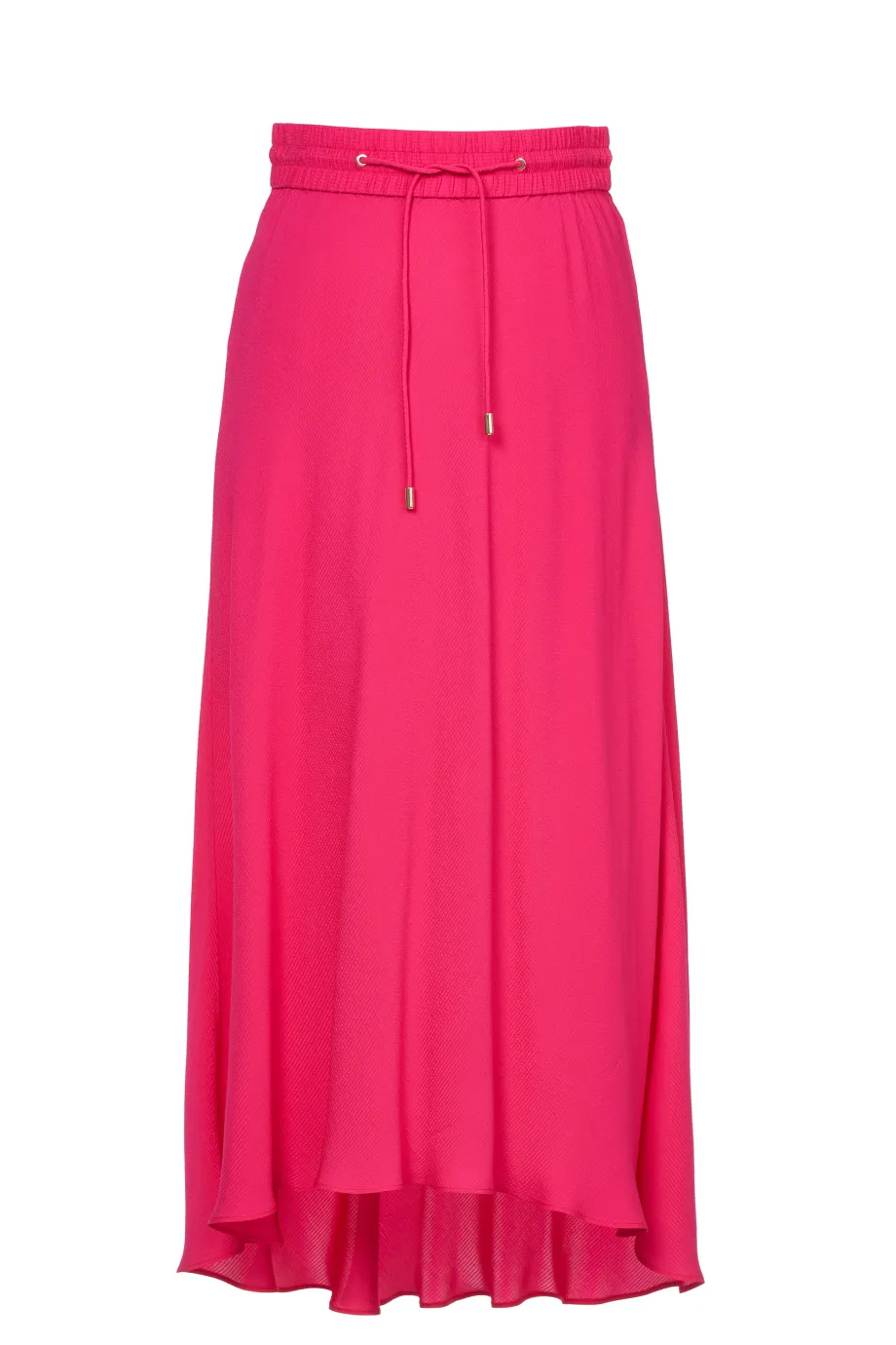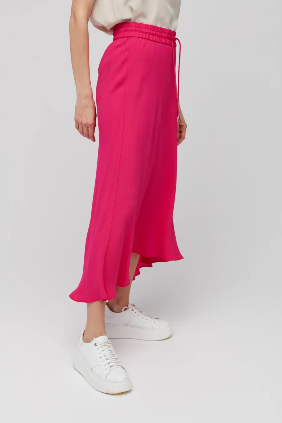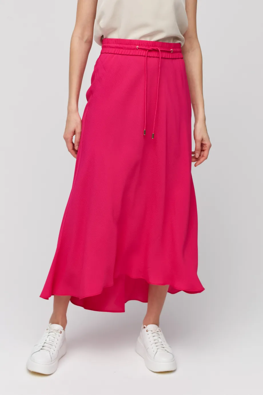 Amarantowa spódnica ma typową długość maxi, ale wyróżnia ją asymetryczny krój. Z przodu jest odrobinę krótsza, co jeszcze mocniej podkreśla jej lekki i zwiewny charakter, a Tobie pozwala dyskretnie wyeksponować zgrabne łydki. Talia jest regulowana za pomocą wszytej szerokiej gumy oraz troczków ze złotymi wykończeniami. Sportowe akcenty pełnią tutaj nie tylko rolę estetyczną, ale i praktyczną, umożliwiając łatwe dopasowanie spódnicy do sylwetki.
