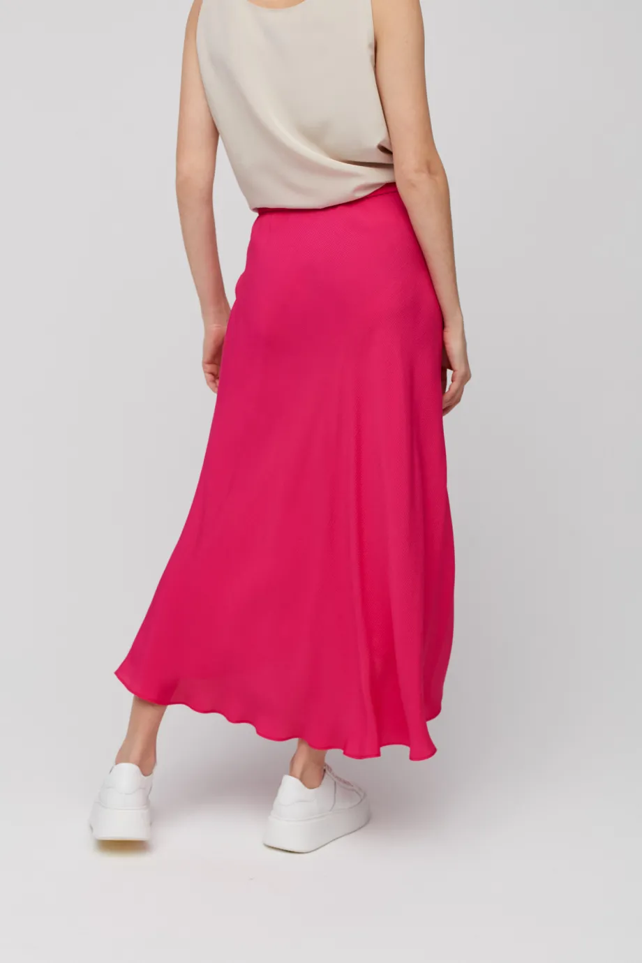 Spódnica z wiskozy odznacza się mocno nasyconym kolorem. Amarant króluje w letnich kolekcjach domów mody damskiej, a w liniach jesienno-zimowych wkracza na zupełnie inny poziom. Ta zmysłowa, bardzo kobieca barwa fantastycznie wygląda w kontekście wszelkich odcieni bieli. A jeśli lubisz podążać za trendami, odważ się na nieoczywiste, za to ultramodne połączenia amarantu z zimnym beżem oraz wytwornym taupe. Do zwiewnej spódnicy maxi w kolorze amarantowym możesz również założyć dedykowaną bluzkę z długim rękawem, z tej samej tkaniny, dostępną w naszym sklepie.