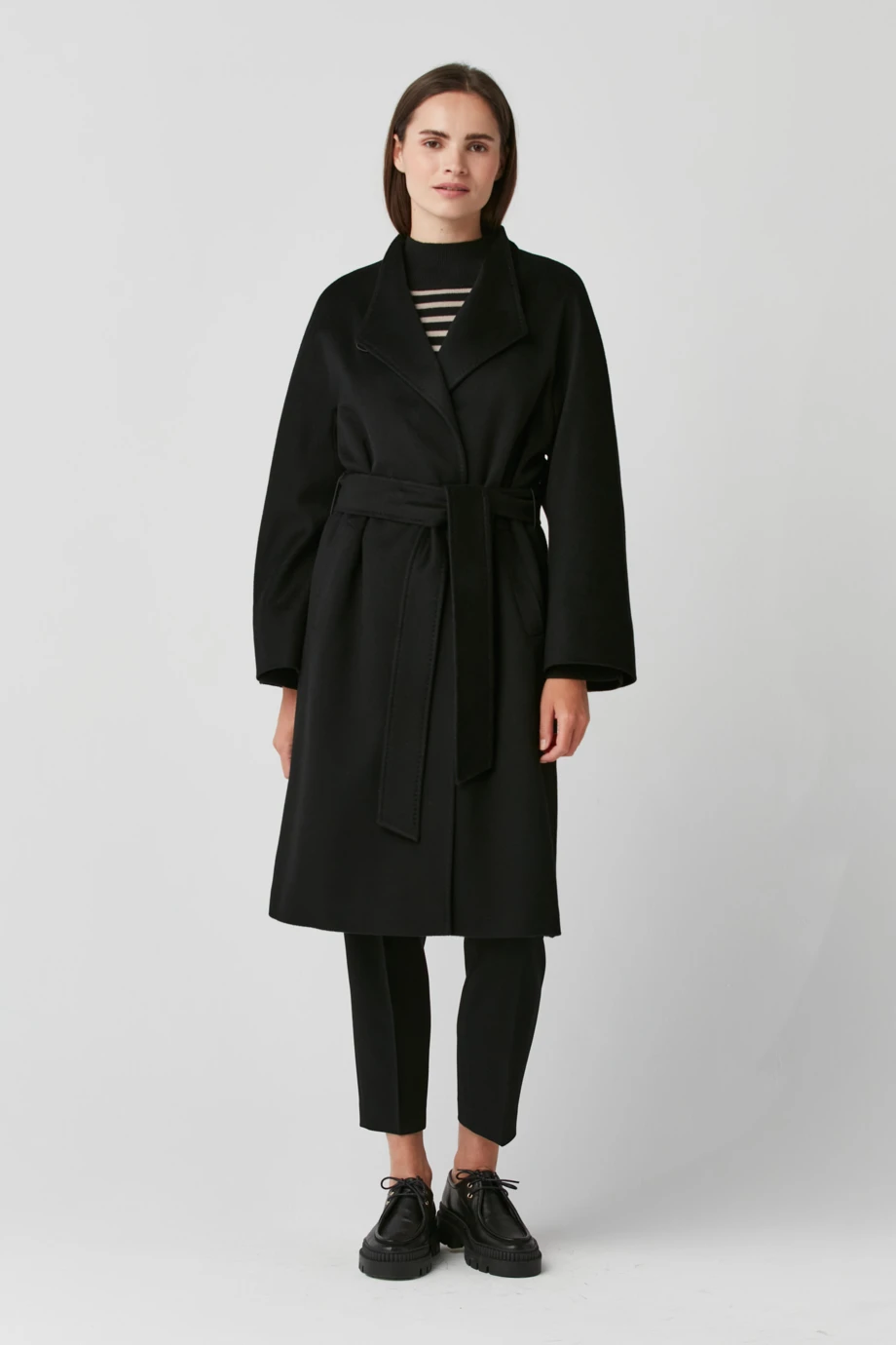 Nasz czarny płaszcz wykonany jest z najwyższej jakości wełny kaszmirowej, co nadaje mu wyjątkowej miękkości, lekkości i sprężystości, a jego klasyczny kolor czarny sprawia, że jest to ponadczasowy dodatek do Twojej kolekcji, pasujący do wielu stylizacji. Czarny płaszcz z paskiem podkreślającym talię, nada Twojej sylwetce kobiecego charakteru.