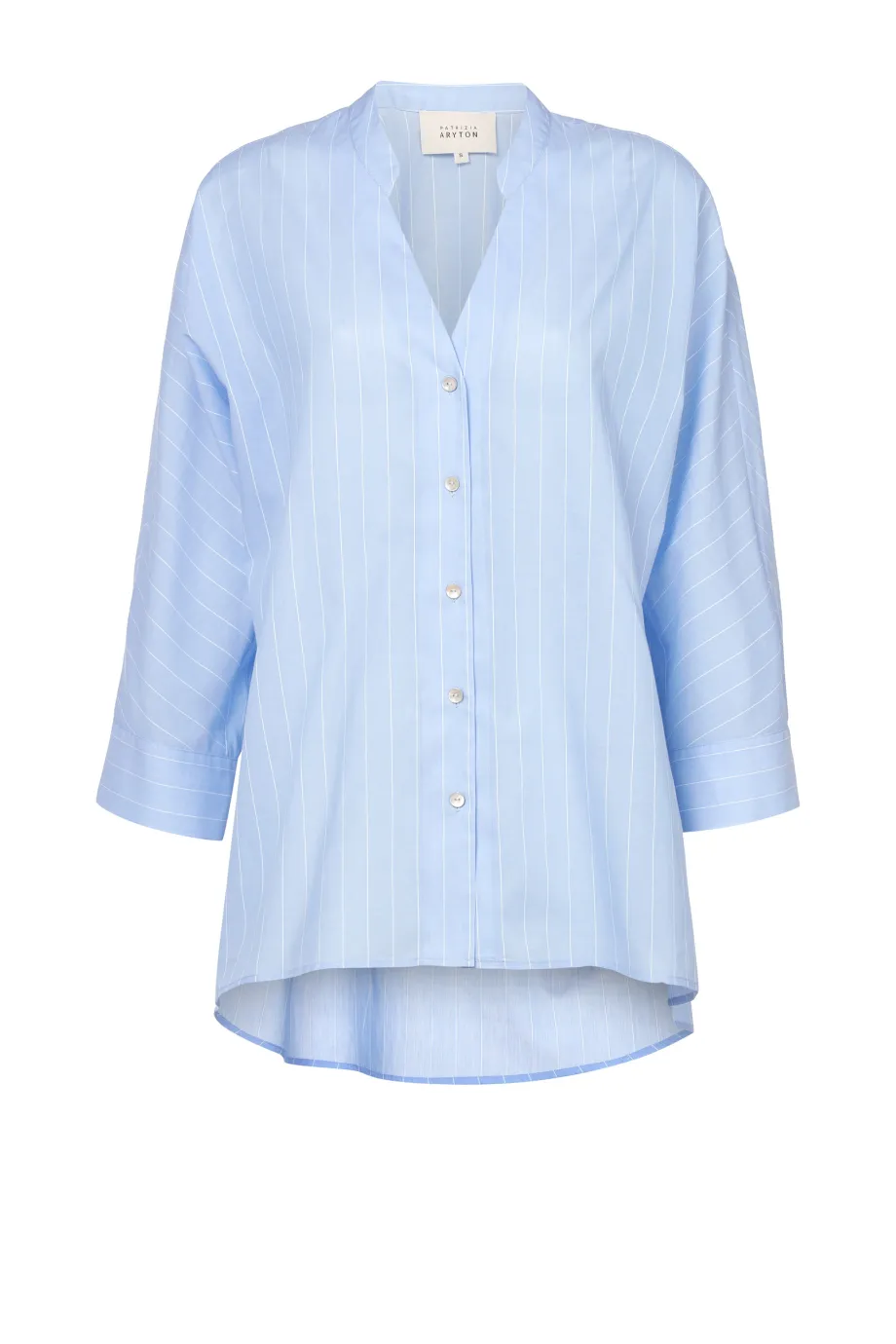 Bawełnianą koszulę Patrizia Aryton wyróżniają luźna forma oraz zaokrąglony, asymetryczny dół. Ubranie jest dłuższe z tyłu, dzięki czemu ładnie się układa na ciele, sprawia wrażenie lekkiego jak mgiełka i pięknie prezentuje się w ruchu. Jego odcień to twarzowy błękit, czyli wiodący motyw kolorystyczny sezonu wiosna-lato, który jest na tyle uniwersalny, że nadaje się na każdą porę roku.
