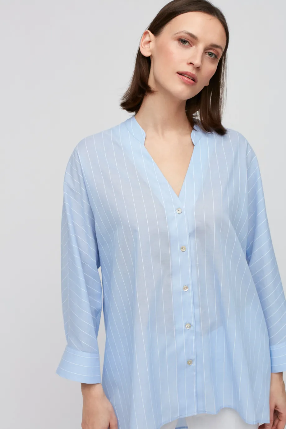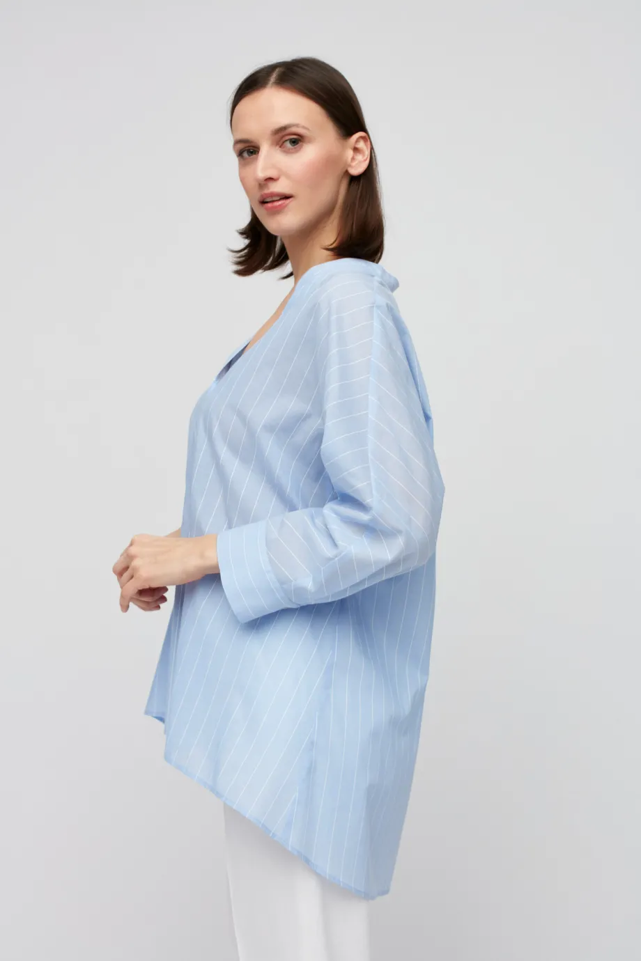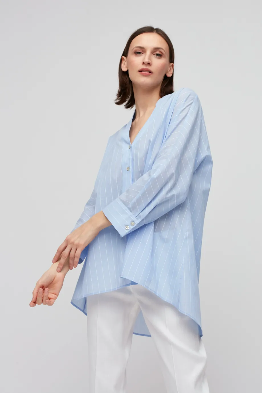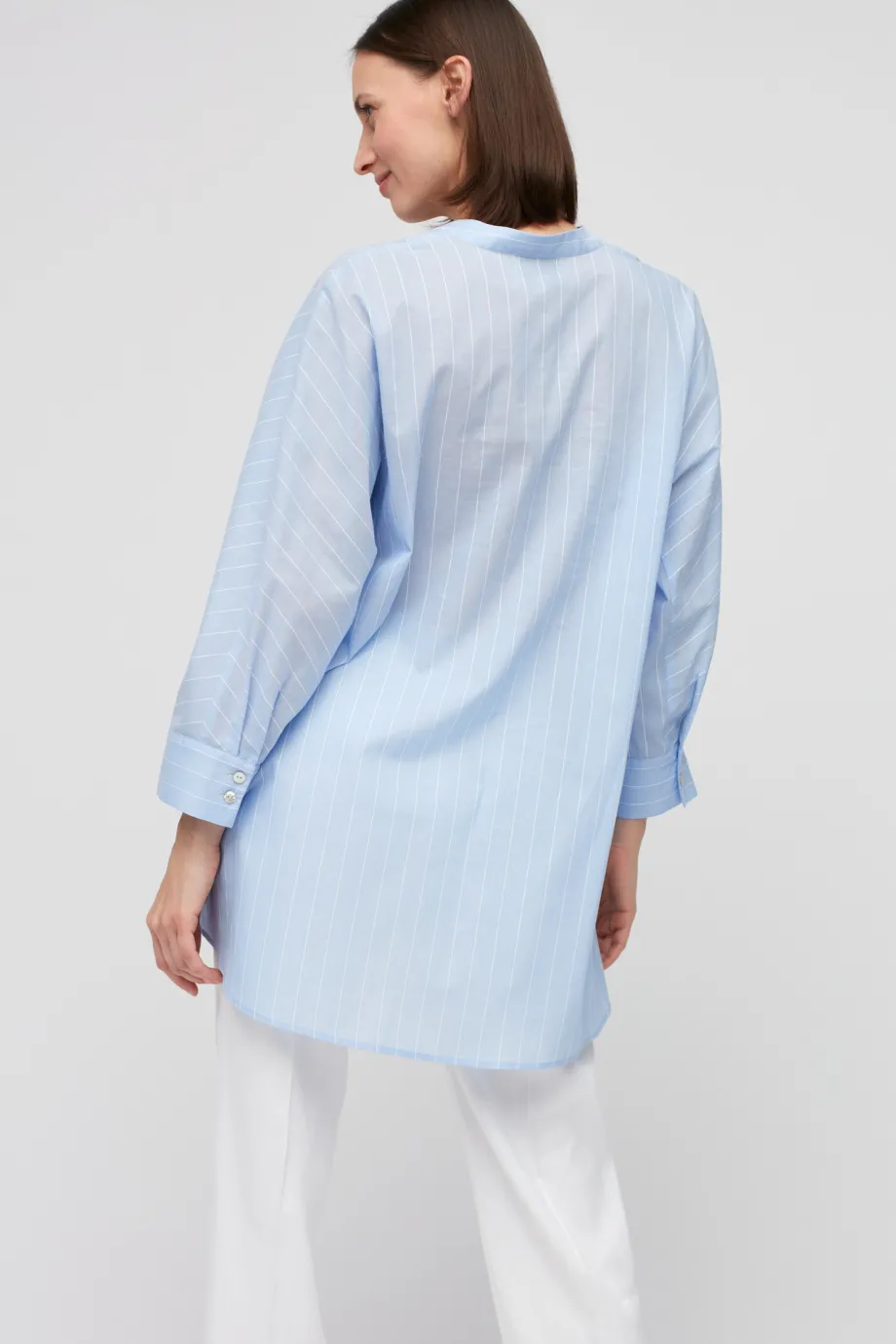 Nasza błękitna koszula damska oversize ma białe wąskie prążki, które na tułowiu układają się podłużnie, a na opuszczonych rękawach typu kimono - poprzecznie. Taki wzór pracuje na korzyść każdej sylwetki. Podobnie jak wysmuklający optycznie figurę dekolt V, który wykończono niską, niezobowiązującą stójką. Model jest zapinany na małe, dyskretne guziki.
