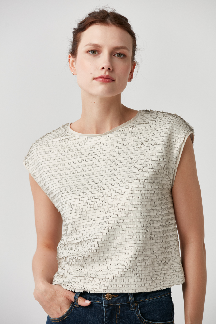 Ta krótka bluzka z krótkim rękawem doskonale wygląda zarówno w kontekście casualowych, jak i szlachetnych materiałów. Ma prostą formę, a odcień chłodnego beżu jako kolor bazowy dobrze harmonizuje niemal ze wszystkimi innymi barwami. Prostokątne cekiny ustawiono ciasno w poziomych rzędach, co daje efekt przestrzennej, eleganckiej faktury. Dekolt i zakończenia rękawów obszyto cienką beżową lamówką.