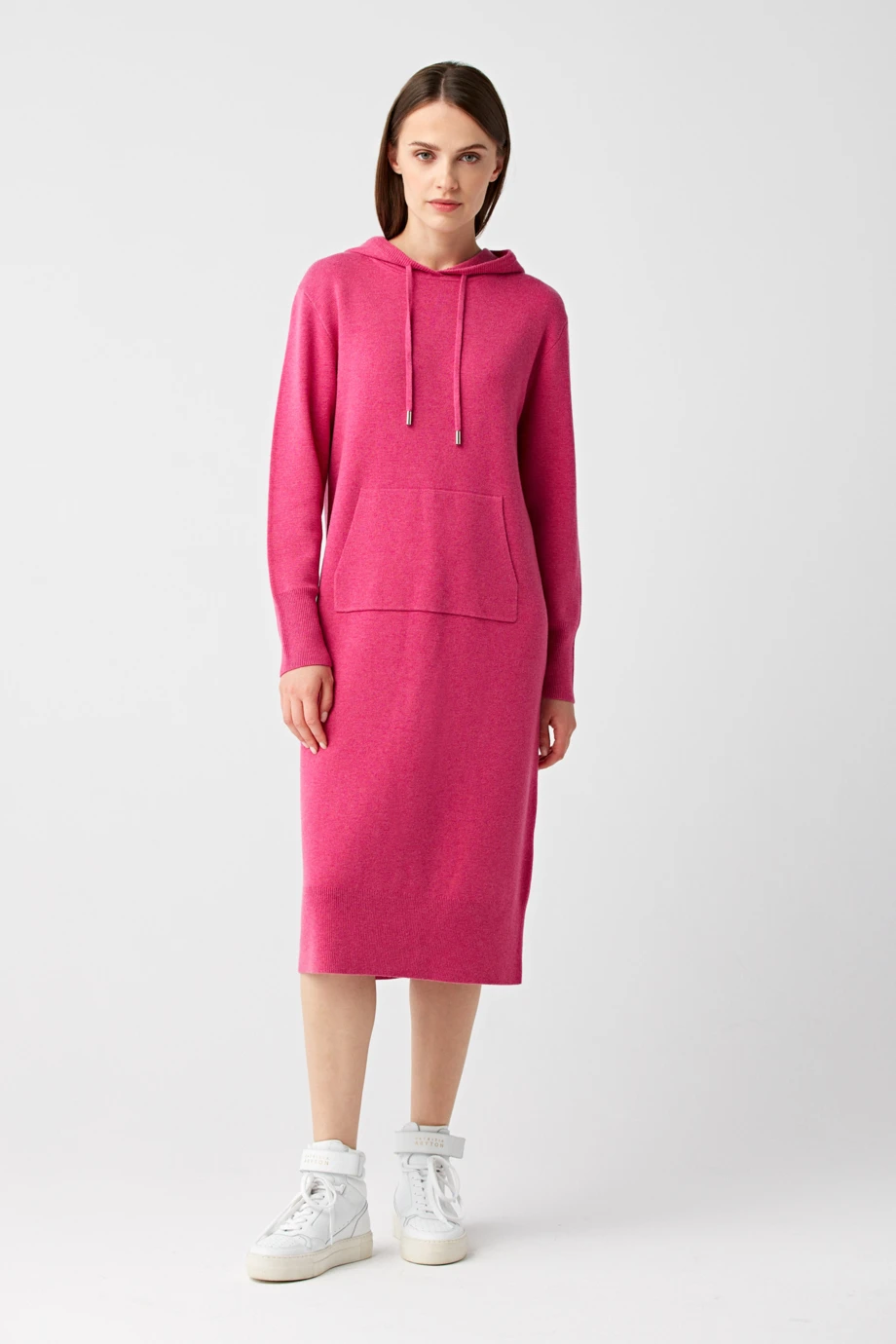 Różowa sukienka midi zdecydowanie przyciągnie uwagę kobiet, które kochają odważne kolory. Prosty, nieskomplikowany krój z długim rękawem i praktyczną kieszenią typu “kangurka” tworzy połączenie klasyki z nowoczesnością, a kaptur dodaje całości nieco nieformalnego, sportowego charakteru. Na uwagę zasługuje również wyjątkowa gęstość uiglenia (12GG) i elastyczny splot rib 1:1, które sprawiają, że nasza amarantowa sukienka z wiskozy doskonale układa się na sylwetce, nie tracąc przy tym swojego kształtu.