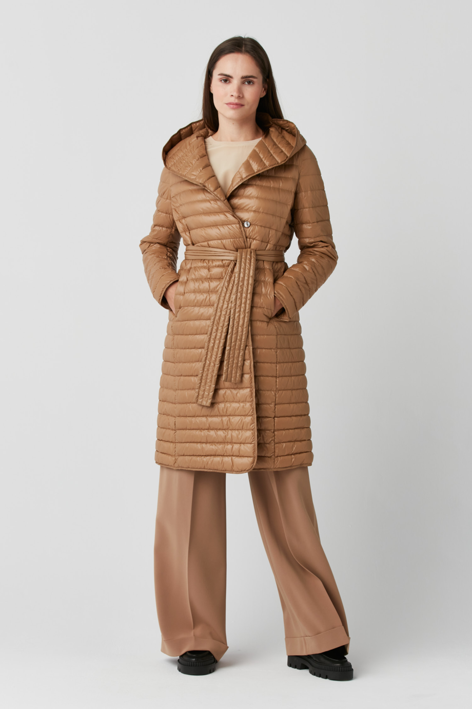 Lekką kurtkę z kapturem Mila wyróżnia jej uniwersalność, model ten zaprojektowaliśmy tak, abyś mogła nosić go zarówno samodzielnie, jak i jako dodatkową warstwę docieplającą pod płaszcz. Ta camelowa kurtka damska posiada klasyczne zapięcie na guziki i elegancki pasek, które nadają jej wyjątkowego charakteru, jednocześnie podkreślając sylwetkę. Model Mila dostępny jest w ponadczasowym kolorze camel, który doskonale komponuje się z różnorodnymi stylizacjami, jednak zadbaliśmy także o możliwość dopasowania go do indywidualnych preferencji, dlatego naszą puchową kurtkę z paskiem znajdziesz też w wersji subtelniejszej (zimny beż) oraz bardziej wyrazistej (granat atramentowy).