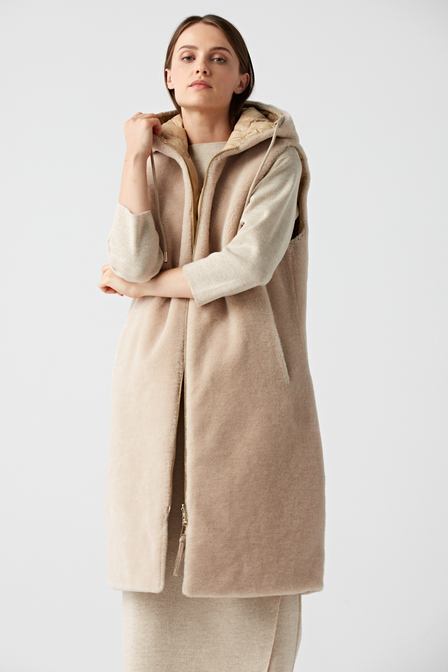 - Długa beżowa kamizelka z kapturem