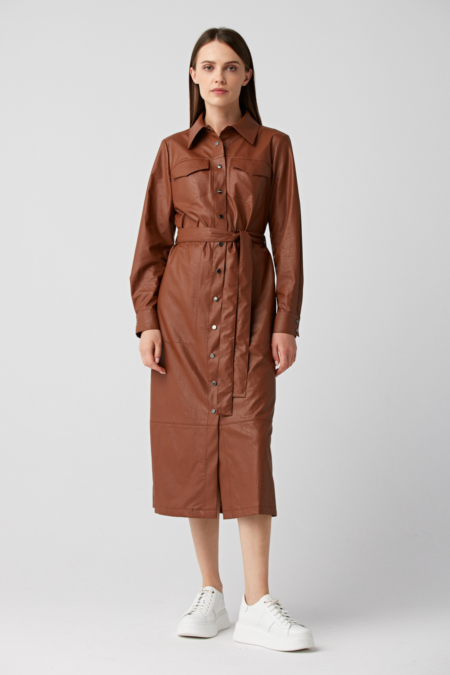 Nasza sukienka szmizjerka midi z paskiem ma odcień, który na stałe wpisał się w DNA marki Patrizia Aryton. Luksusowy camel może być Twoim kolorem podstawowym lub stanowić wyrazisty kontrast dla stonowanej, codziennej bazy.