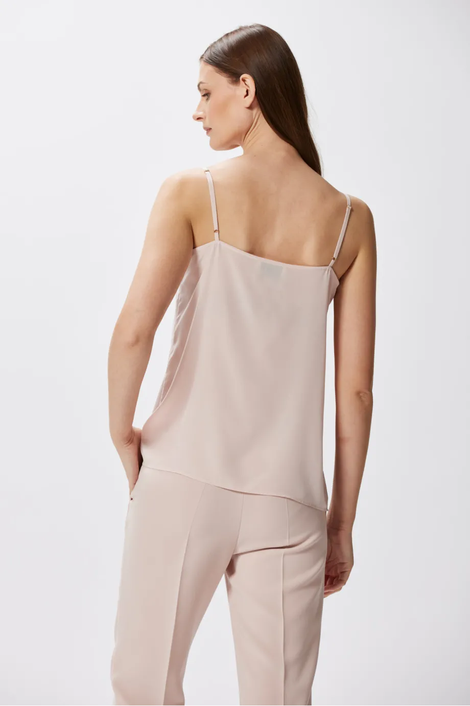 Ten top na regulowanych ramiączkach ma luźną formę i sięga mniej więcej do linii bioder. Możesz więc go nosić w opcji do wewnątrz spodni i spódnicy lub na wierzch. Jest doskonałą bazą do żakietów, ale świetnie komponuje się także z kardiganem, bomberką czy kurtką doubleface. Nie za głęboki, rozszerzany dekolt w szpic pozwala delikatnie wysmuklić wizualnie sylwetkę i jednocześnie wciąż zachować profesjonalny wizerunek. Jedwabny top Patrizia Aryton to luksus, który zapewni Ci niezwykłą przyjemność noszenia także wtedy, gdy będziesz mieć ochotę na dzienny smart casualowy look.
