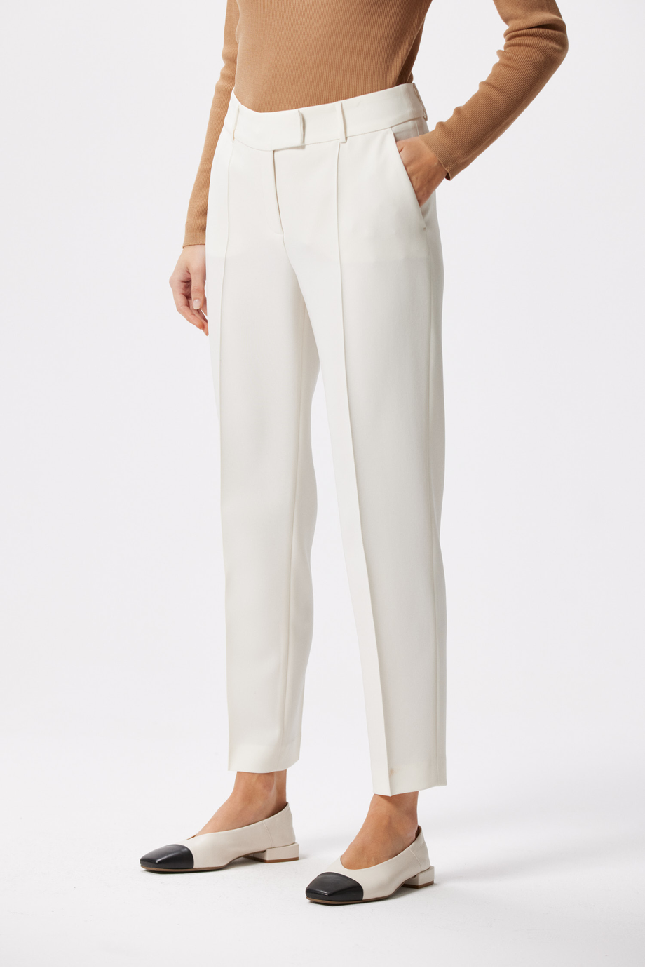Białe spodnie w odcieniu delikatnej śmietanki do garnituru doskonale wpisują się w trendy biznesowej mody. Klasyczny fason z lekko zwężaną nogawką i przeszytym kantem delikatnie podkreśla kształt sylwetki, dodając jej smukłości i kobiecości. Spodnie Lotto doskonale współgrają z naszą kamizelką z tej samej tkaniny, tworząc perfekcyjny duet na każde oficjalne wyjście.