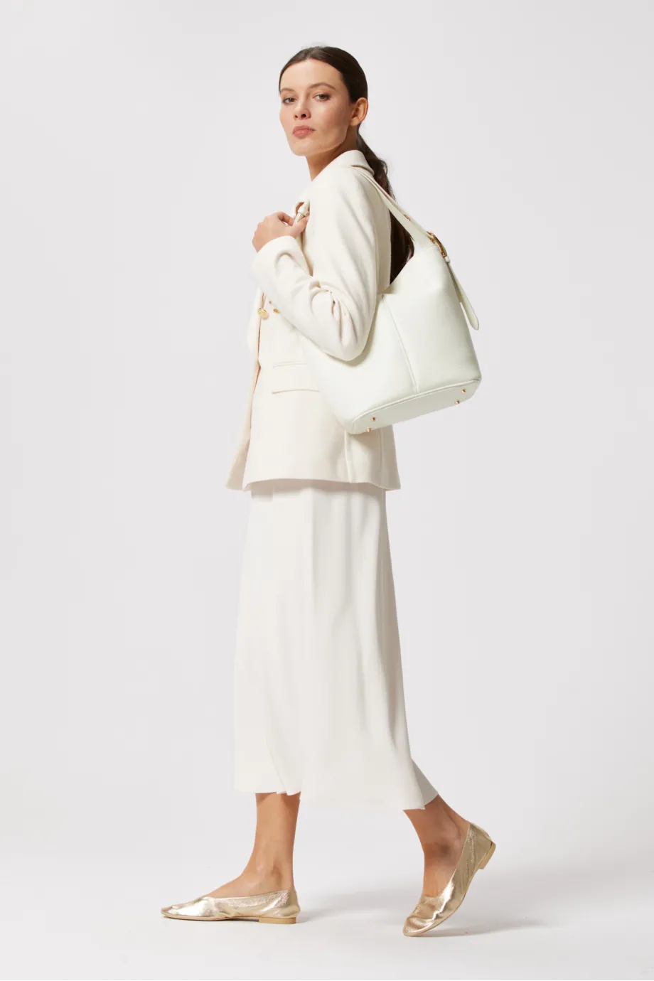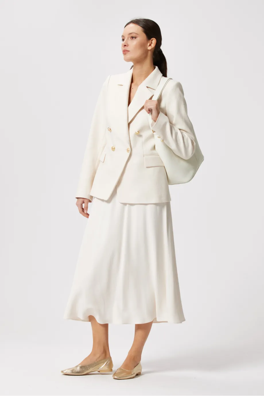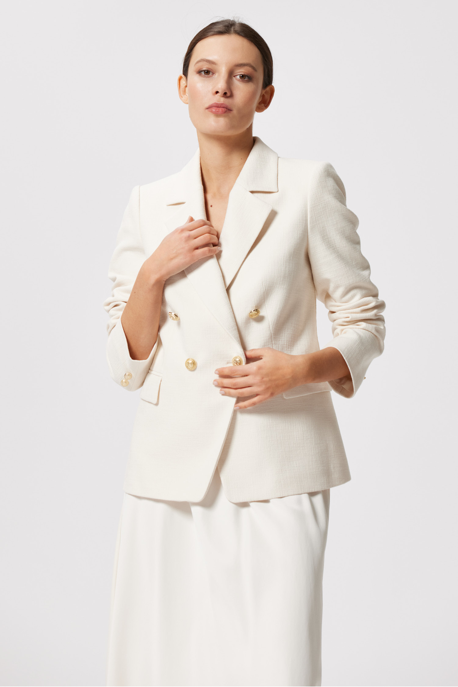 W naszej kapsule Smart Casual znajdują się nie tylko propozycje stonowanych ubrań, ale też modele z elementami stylu koktajlowego. Ten biały żakiet ze złotymi guzikami w detalach fasonu oraz kolorze nawiązuje do trendów marynistycznego i uniwersyteckiego, znanych z naszych poprzednich kolekcji. Polubisz go też za wszechstronność i oryginalną fakturę materiału.