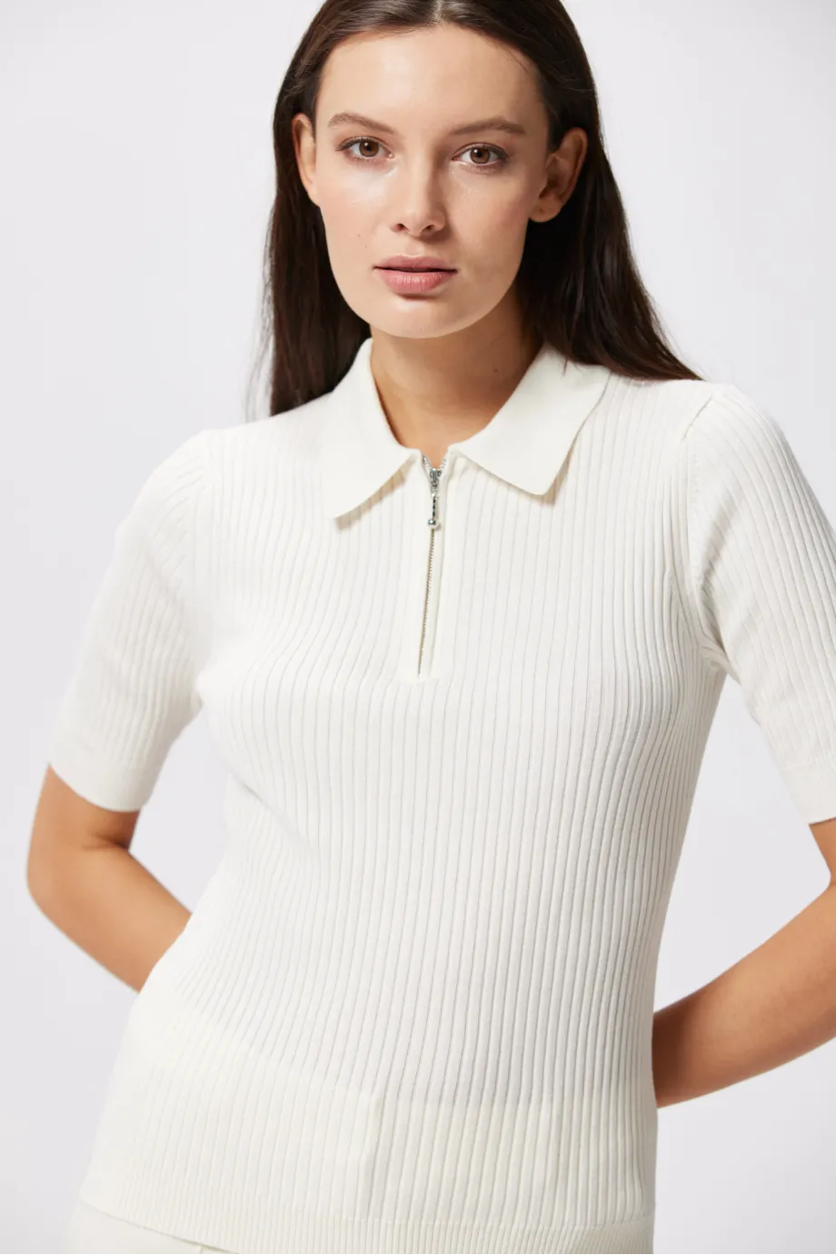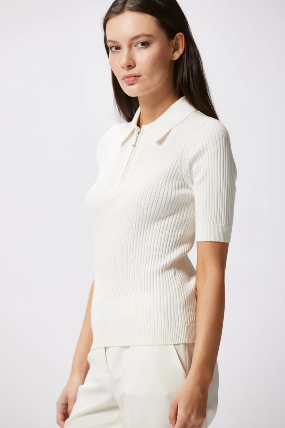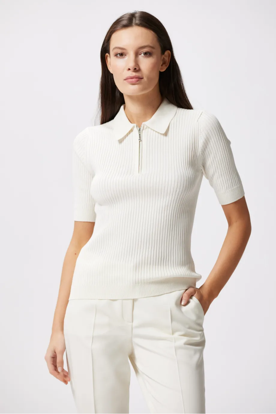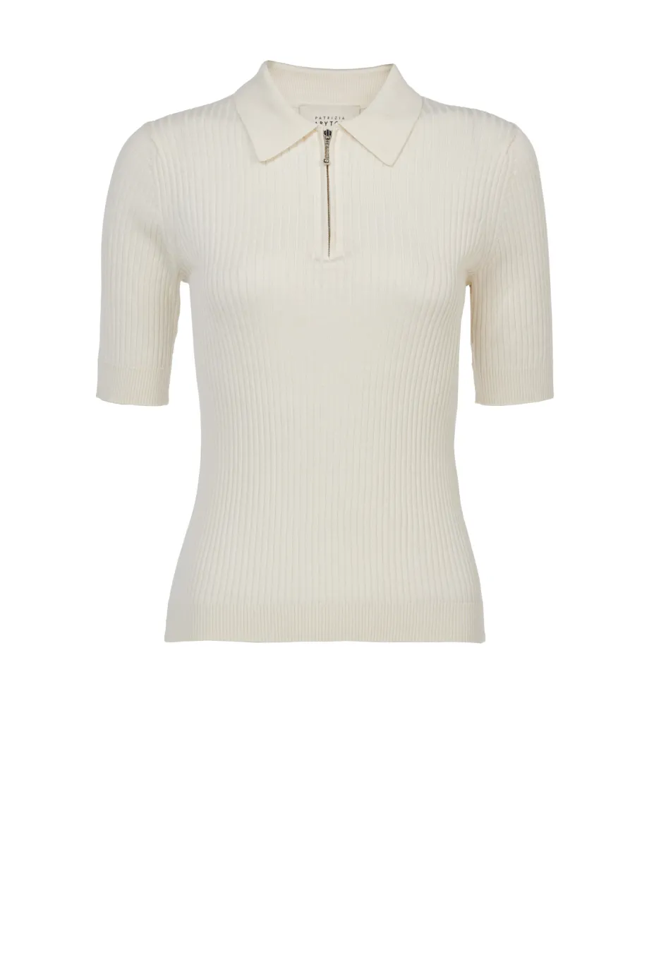 Biała bluzka polo Patrizia Aryton ma kołnierzyk i zapięcie na suwak w srebrnym kolorze, zakończony maleńką kuleczką. Ten niemal biżuteryjny detal dodaje całości dyskretnego blasku. Krótkie rękawy typu wstawianego to krok w stronę elegancji i szyku.