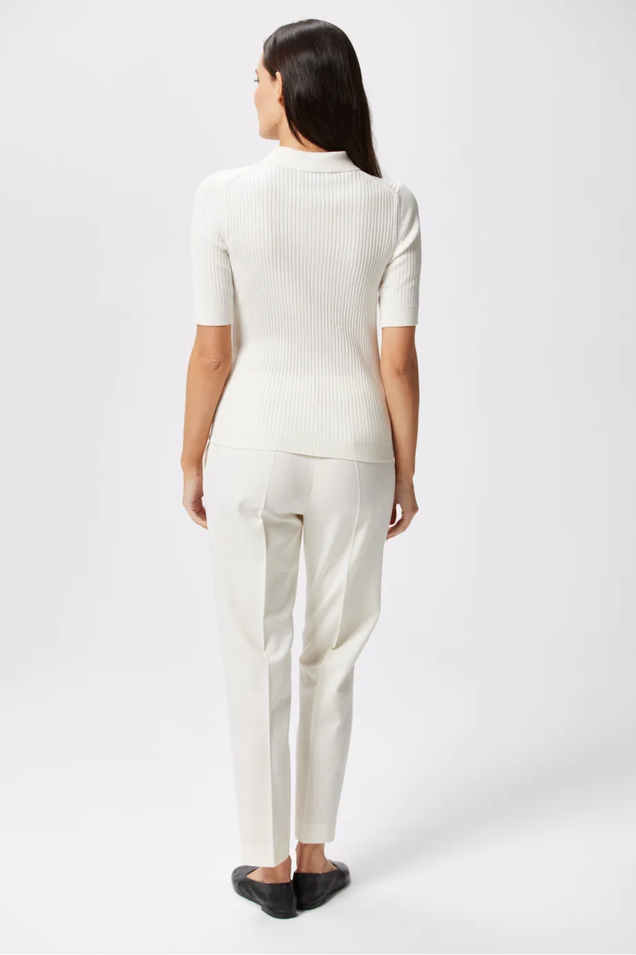 Nasza biała bluzka bawełniana, damska, została uszyta z cienkiej i mięsistej dzianiny, powstałej na maszynie o uigleniu 14 GG, która dzięki swojej fakturze sprawia wrażenie nieco grubszej. Splot rib 4x2 tworzy trójwymiarowy pionowy prążek, który wyszczupla optycznie i pomaga w pozycjonowaniu sylwetki. Model reprezentuje fasony bliżej ciała.