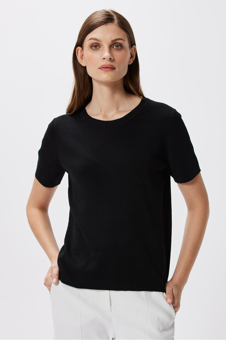 Dzianinowa bluzka z krótkim rękawem od Patrizia Aryton jest wykonana z najwyższej jakości lnu francuskiego (81%) i jedwabiu (9%). Ich połączenie tworzy dzianinę nie tylko niezwykle miękką i przyjemną w dotyku, ale także trwałą i odporną na zmechacenia. Dostępna w różnych rozmiarach: 32/34, 36/38, 40/42, 44/46 nasza czarna bluzka doskonale dopasuje się do Twojej sylwetki, podkreślając jej piękno i kobiecość.