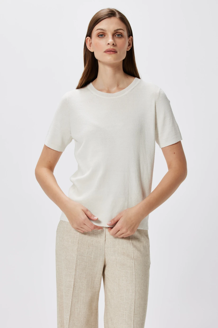 - Biała bluzka z lnem i jedwabiem