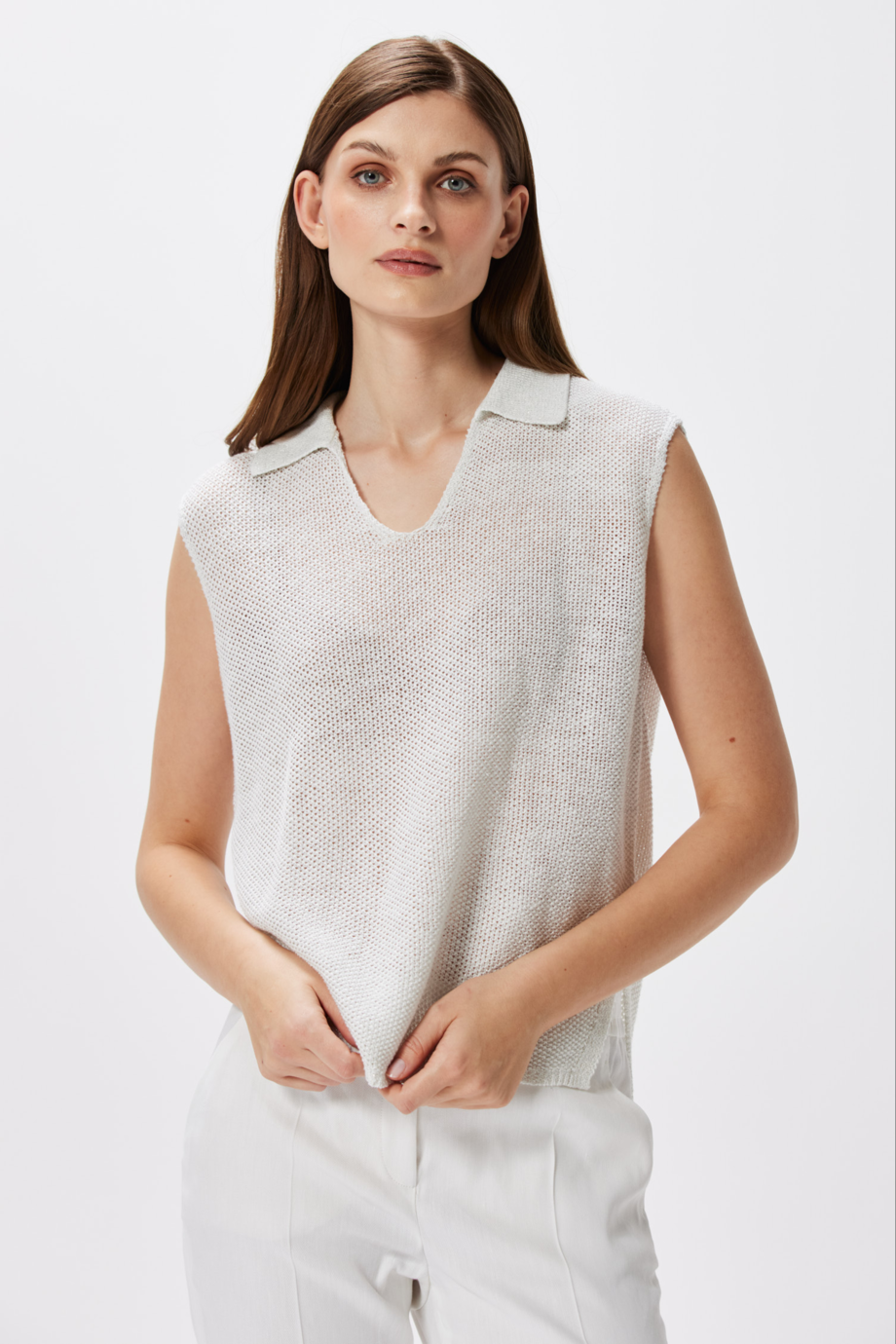Poczuj się stylowo w naszej białej lnianej bluzce damskiej, która łączy w sobie naturalną elegancję lnu z subtelnym blaskiem metalicznej nici. Elegancka bluzka bez rękawów z kołnierzykiem polo to idealna propozycja na ciepłe dni w zestawieniu z białymi spodniami i czarnymi klapkami z naszej kolekcji. Poczuj najwyższą jakość, sięgając po naszą dzianinową bluzkę z kołnierzykiem!