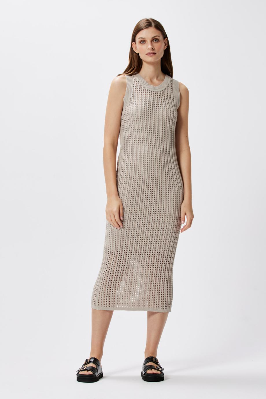 Odkryj beżową dzianinową sukienkę midi, która idealnie wpisze się w Twój letni styl! Wykonana z miękkiej, bawełnianej dzianiny, doskonale dopasuje się do Twojej sylwetki, zapewniając komfort i podkreślając atuty kobiecej figury. Wykonana na maszynie o uigleniu 7 GG, sukienka charakteryzuje się wyjątkowym ażurowym splotem, dodającym jej lekkości i subtelnego uroku. Lekka i zwiewna konstrukcja bez rękawów oraz podszewka z czystej bawełny, zapewnią Ci idealny komfort termiczny w upalne dni.