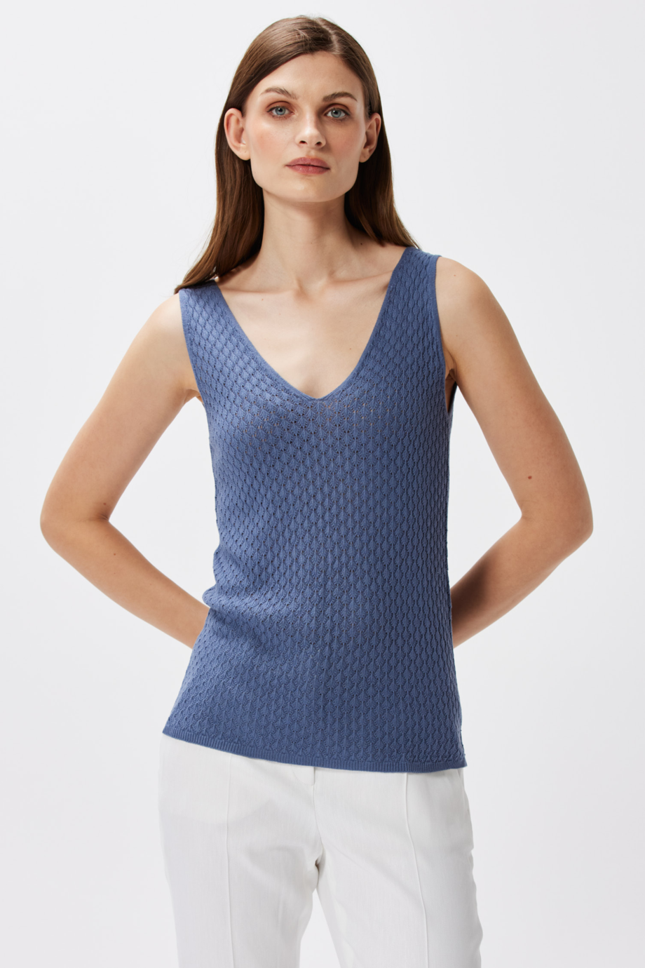 Elegancki top na szerokich ramiączkach to idealny sposób na podkreślenie swojej kobiecości i dodanie letniego charakteru każdej stylizacji. Delikatny ażurowy splot sprawia, że ta propozycja jest niezwykle lekka, a subtelny dekolt w szpic wydłuża szyję i dodaje całości zmysłowości. Wiskozowy top na ramiączkach jest wyjątkowo miękki i przyjemny w dotyku, ta miękka dzianina dopasowuje się do sylwetki, delikatnie ją podkreślając. Top z dekoltem V dostępny jest w kolorze jeans, który doskonale komponuje się z różnymi elementami garderoby, dzięki czemu Twoje letnie stylizacje nabiorą nowego charakteru.