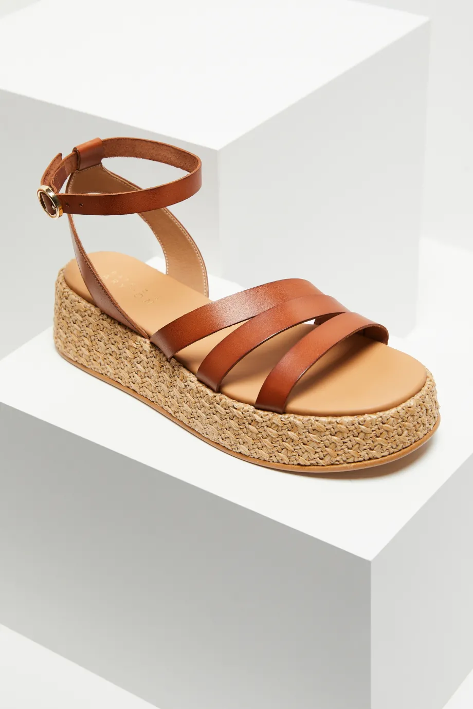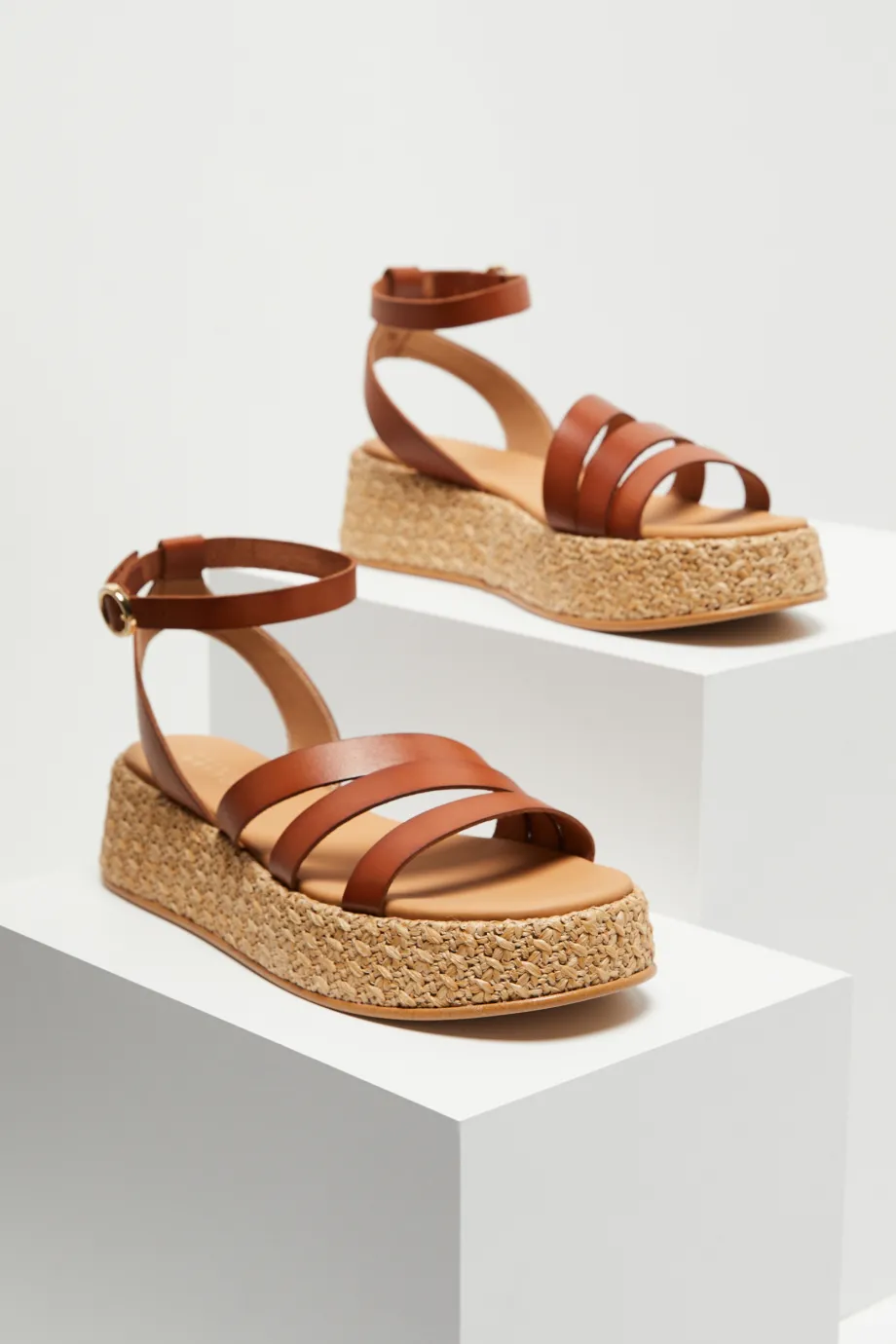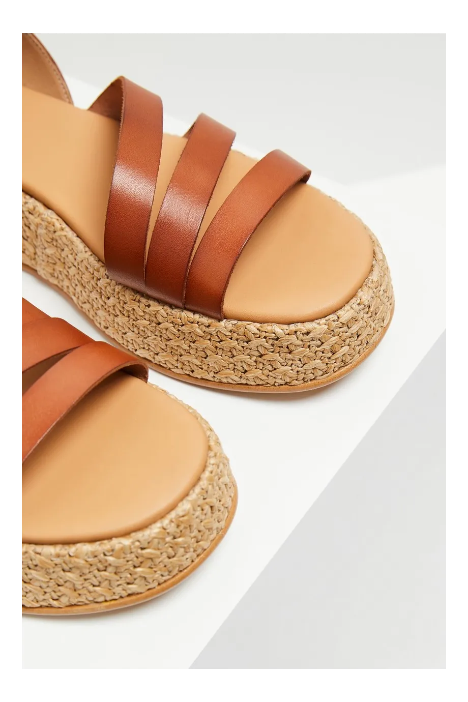 Te eleganckie sandały damskie, skórzane, z odkrytą piętą, wzbogacono o stabilny koturn, dzięki któremu zyskasz aż 5 cm wzrostu. Jego pionową płaszczyznę ozdobiono egzotyczną plecionką z rafii, czyli włókna pochodzącego z palmy. Naturalny kolor rafii to beż, który fantastycznie komponuje się z luksusową ciemniejszą barwą wielbłądzią skórzanych pasków i nieco jaśniejszą od nich wkładką sandałów. Modne sandały na platformie mają średniej szerokości poprzeczne paski i regulowane zapięcie na kostce. Okrągła klamra w kolorze złota to delikatny, biżuteryjny akcent.