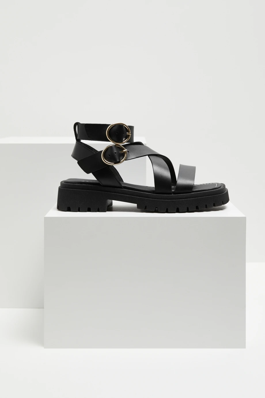 Czarne sandały z zapięciem na kostce i wyższej podeszwie