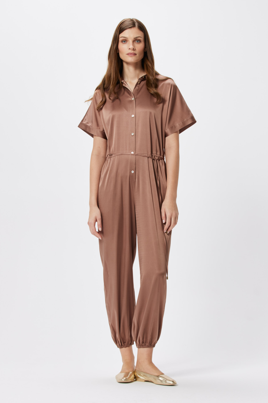 Ten kombinezon z jedwabiu ma odcień brązu pudrowego, czyli rozbielonego z dyskretnymi pigmentami złota i różu. Barwa stanowi jedną z naszych ulubionych w tym sezonie i fantastycznie łączy się ze wszystkimi kolorami bazowymi oraz modnymi pudrowym różem, śmietanką, złotem, czystą bielą, czekoladą, amarantem czy oranżem.