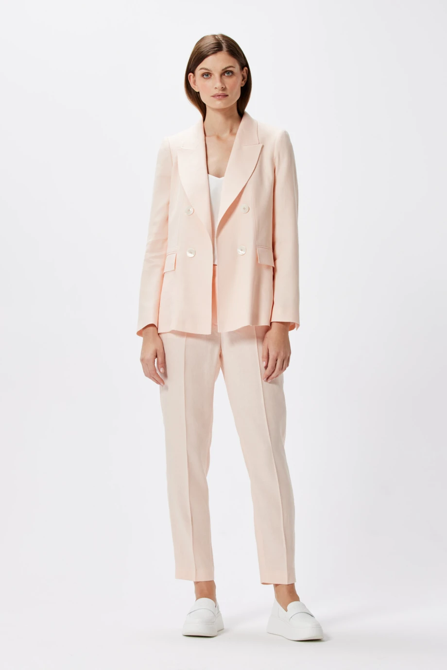 Te eleganckie spodnie lniane, damskie, to cygaretki do garnituru, które możesz kupić solo lub w zestawie z pasującym żakietem. Mają długość mniej-więcej do kostek, a ich nogawki lekko zwężają się ku dołowi. Spodnie są zapinane na kryty zamek i guzik, posiadają kieszenie i są prasowane w kant. Od dobrze znanego, klasycznego modelu Lotto odróżnia je brak szlufek. Zamiast nich na biodrach zastosowano dekoracyjne pagony z guzikiem, wykończone stebnowaniem na krawędziach.