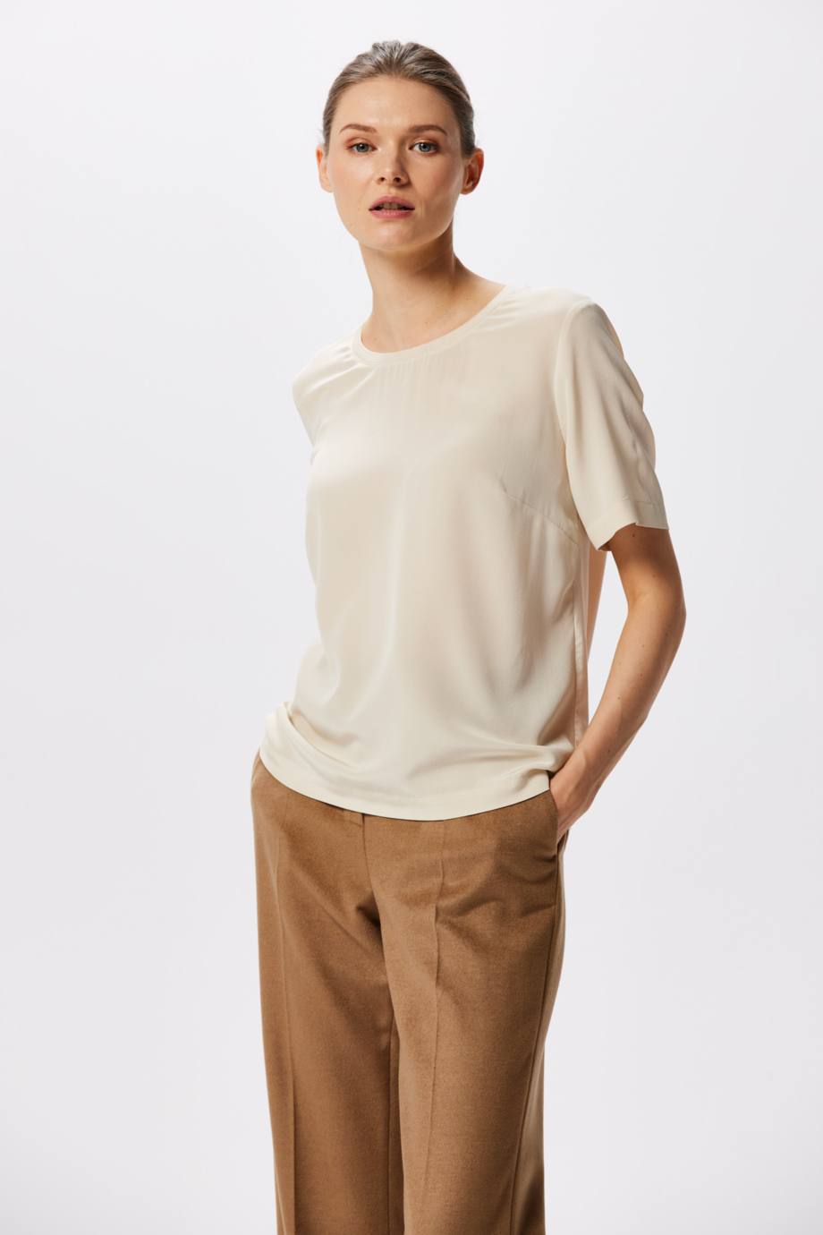 Bluzka z okrągłym dekoltem Patrizia Aryton jest bardziej wszechstronna niż myślisz. Zastąpisz nią biurową koszulę, koktajlowy model do wieczorowej spódnicy, ale też swobodny t-shirt. Jak to możliwe? Wszystko zawdzięczamy jej plastycznemu, ale eleganckiemu krojowi, tkaninie o ultragładkiej powierzchni oraz ponadczasowej i twarzowej barwie. Luźny krój, krótki rękaw i okrągły dekolt gwarantują niezrównaną wygodę. Oddychający, sprawiający wrażenie chłodnego i lekko śliski materiał jest jak druga skóra. A jasny ciepły beż ma moc rozświetlania.
