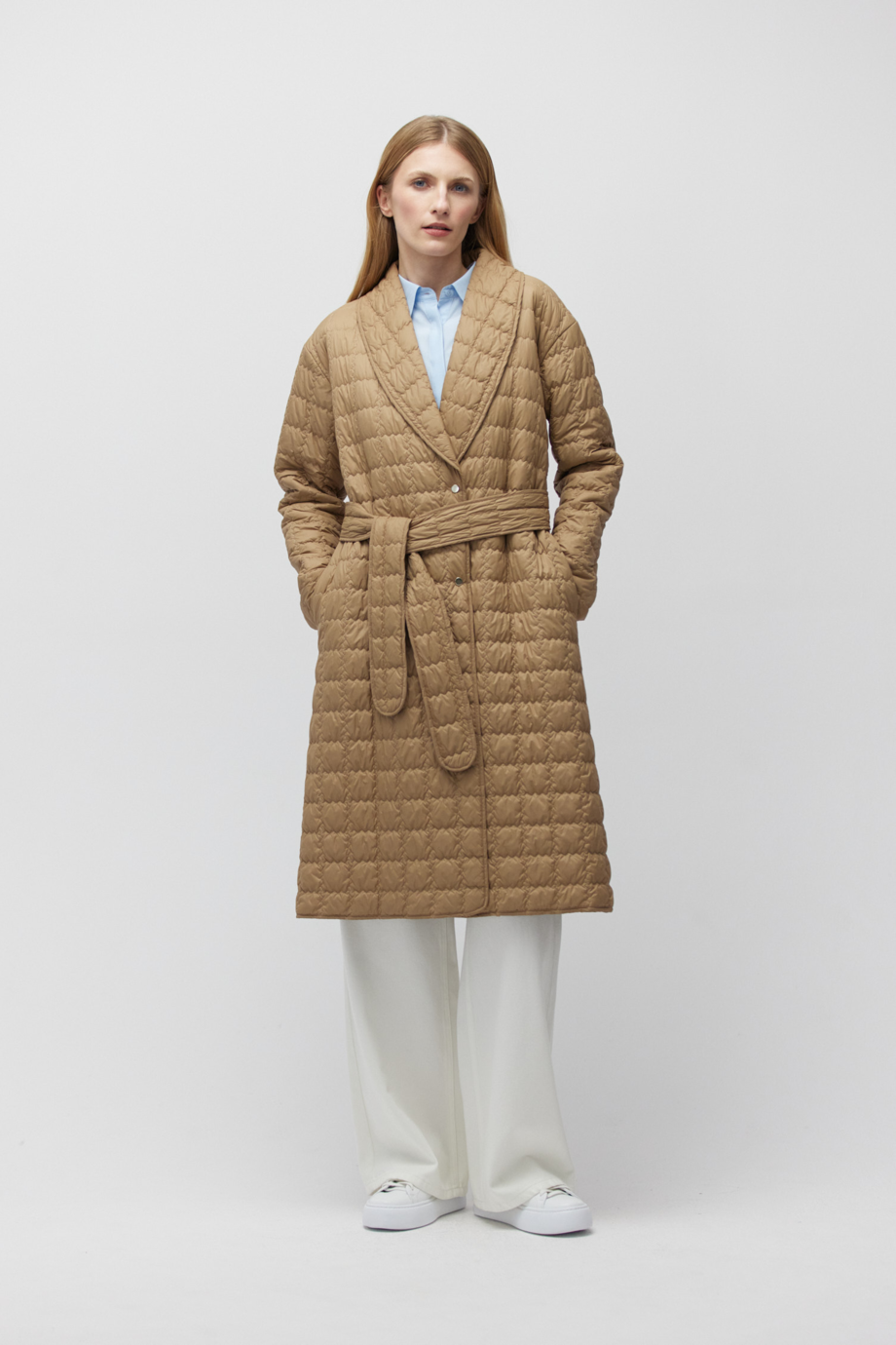 Kurtka z wypełnieniem z wełny wielbłądziej ma zewnętrzną powierzchnię w pikowane kwadraty. Kanciastość wzoru łagodzona jest przez opływowe zakończenia paska do przewiązywania w talii. Efektowny szalowy kołnierz oprócz funkcji estetycznej pełni też rolę zabezpieczenia szyi przed chłodem. Po jego postawieniu nie tylko chronimy dekolt i kark przed wiatrem, ale też nadajemy stylizacji bardziej wyrazisty charakter.