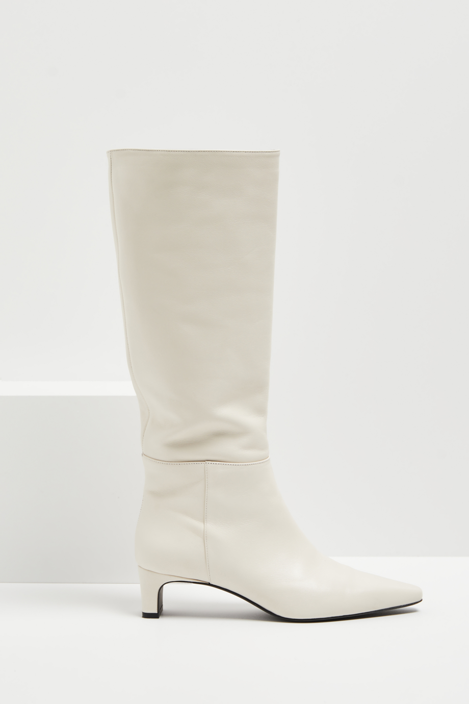 Te kozaki na średnim obcasie, wynoszącym 4 cm, sięgają pod kolano, dlatego świetnie prezentują się w kontekście spódnic, sukienek i spodni każdej długości. Kremowa biel łagodnie harmonizuje z naturalnym odcieniem ludzkiej skóry, z kolei czarny zamek boczny ułatwiający zakładanie oraz czarna podeszwa przyjemnie z nią kontrastują. Nosek w szpic wysmukla stopę, a przeszycia dodają elegancji.