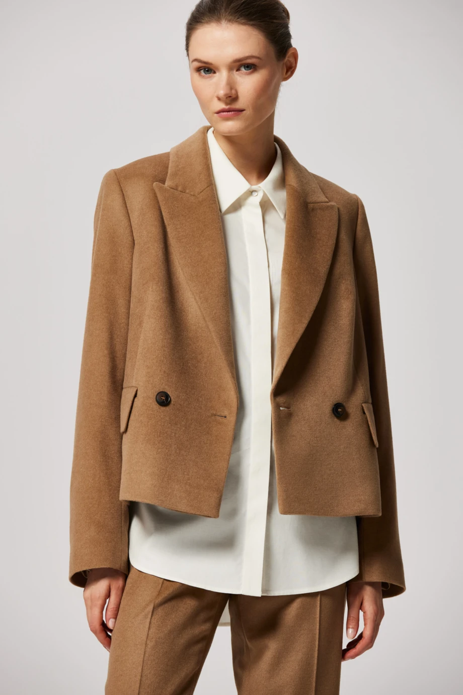 Nasza kurtka dwurzędowa o pudełkowym fasonie przypomina krótki żakiet - idealny, gdy potrzebujesz lekkiego i zarazem wyrazistego okrycia wierzchniego. W chłodne dni w biurze może służyć za górę do garniturowych spodni. Ubranie osadzono na podszewce, a dodatkowa warstwa kaszmiru dodaje miękkości i ciepła, nie zaburzając lekkiej formy.