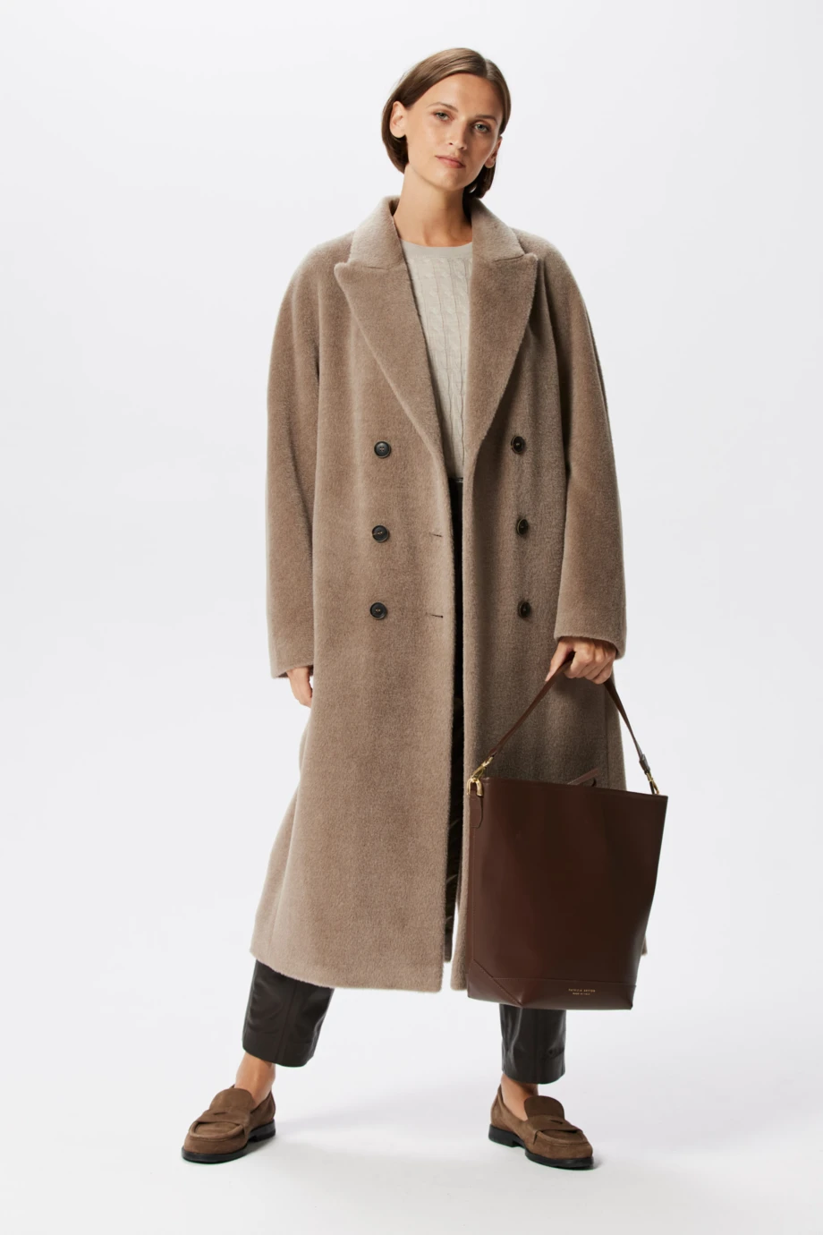 Beżowy płaszcz dwurzędowy z suri alpaką