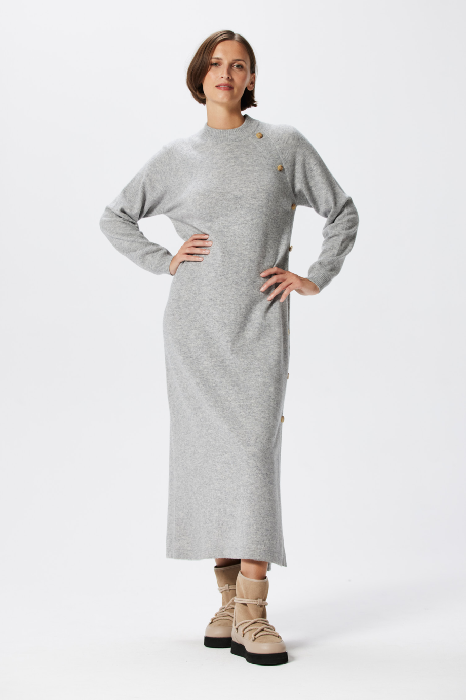 Minimalizm fasonu przełamuje boczne rozcięcie do wysokości kolana, wykończone rzędem dekoracyjnych guzików, poprowadzonych aż do dekoltu. Taka pionowa linia sprzyja optycznemu wydłużeniu figury i nadaje ciekawy, nietuzinkowy efekt. Dzięki długości midi ta sukienka z kaszmirem dobrze chroni nogi przed zimnem i fantastycznie prezentuje się zarówno w kontekście wysokich kozaków, średnich botków czy puchatych śniegowców, jak i wszelkich półbutów, tenisówek lub balerin, które zakładasz po przyjściu do biura.