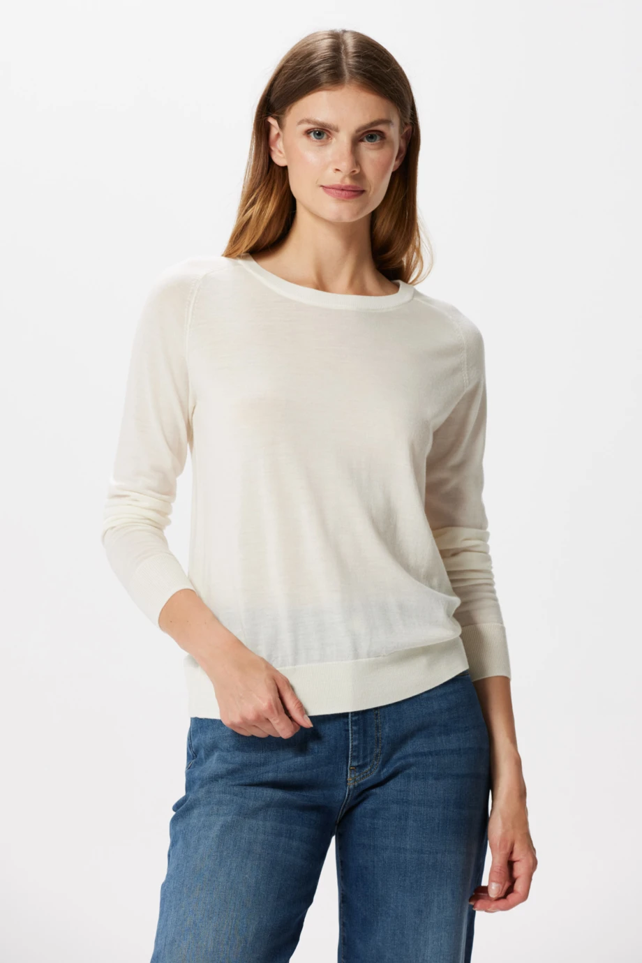 Bluzka z wełny merino Patrizia Aryton ma barwę złamanej bieli, doskonałą szczególnie dla pań, dla których czysta biel nie jest pierwszym odcieniem. Długie rękawy i okrągły dekolt to cechy, które czynią ją uniwersalną, do noszenia solo lub pod żakiet czy kardigan. Raglanowe rękawy subtelnie zmiękczają rysunek ramion.