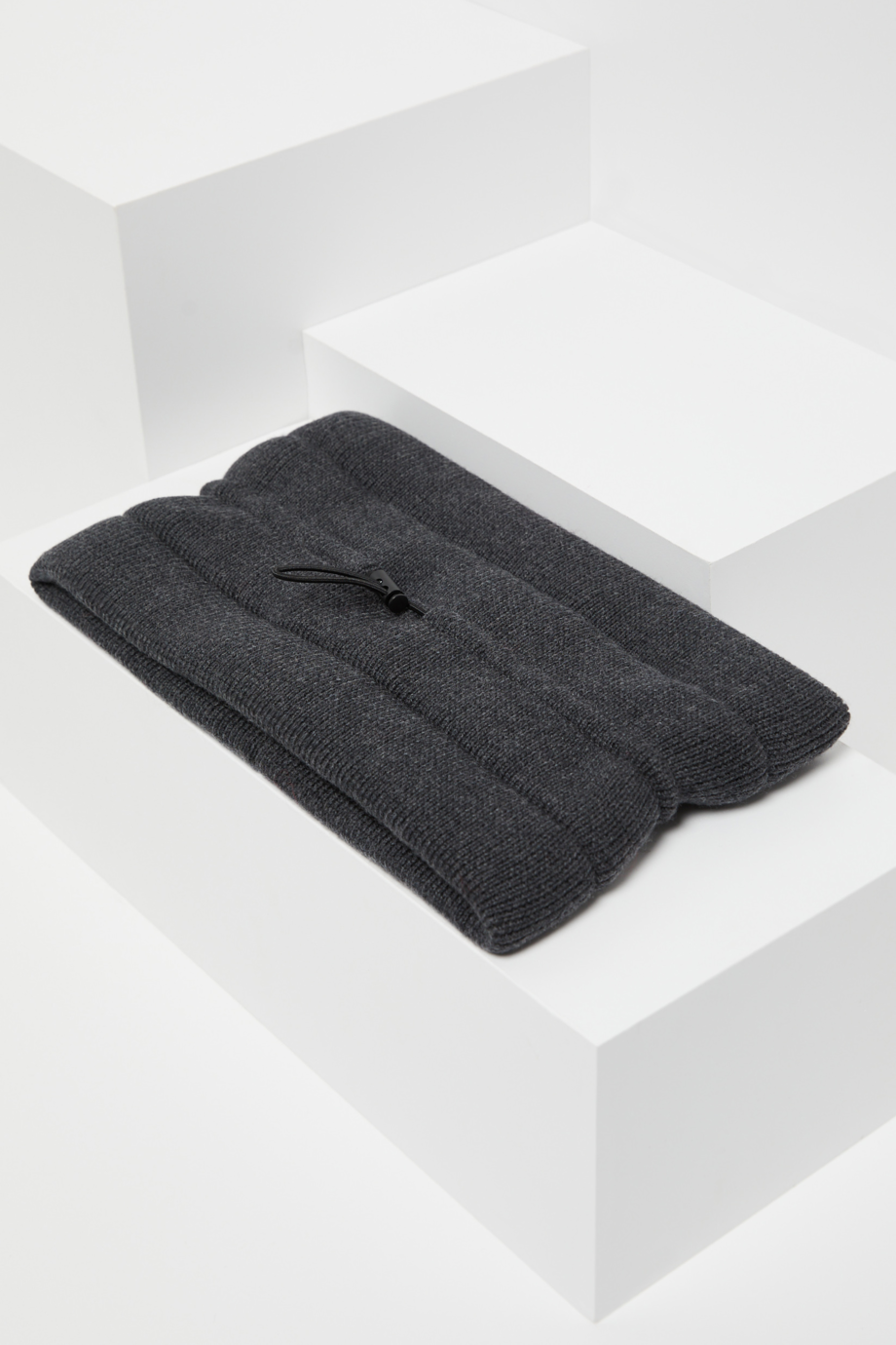 Popielaty komin wełniany Patrizia Aryton wykonano z miękkiej dzianiny powstałej na maszynie o uigleniu 12 GG. Materiał ma drobny i gęsty splot english rib, dlatego dobrze izoluje od zimna i wiatru. Produkt posiada poziome przeszycia a w środku poprowadzono gumowy sznurek, służący do regulacji szerokości celem jak najlepszego dopasowania.