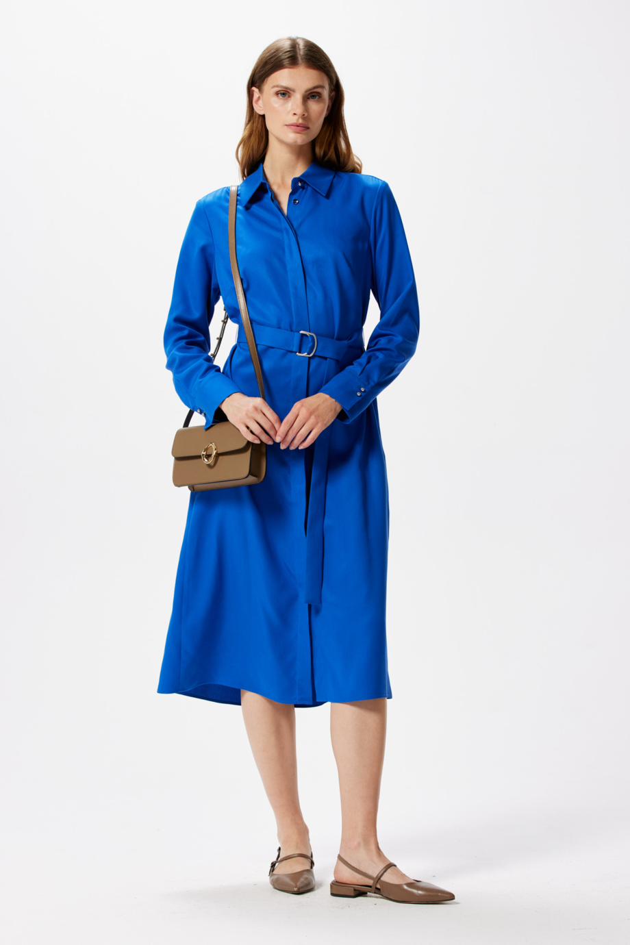 Kobaltowa sukienka szmizjerka midi z paskiem i kołnierzykiem