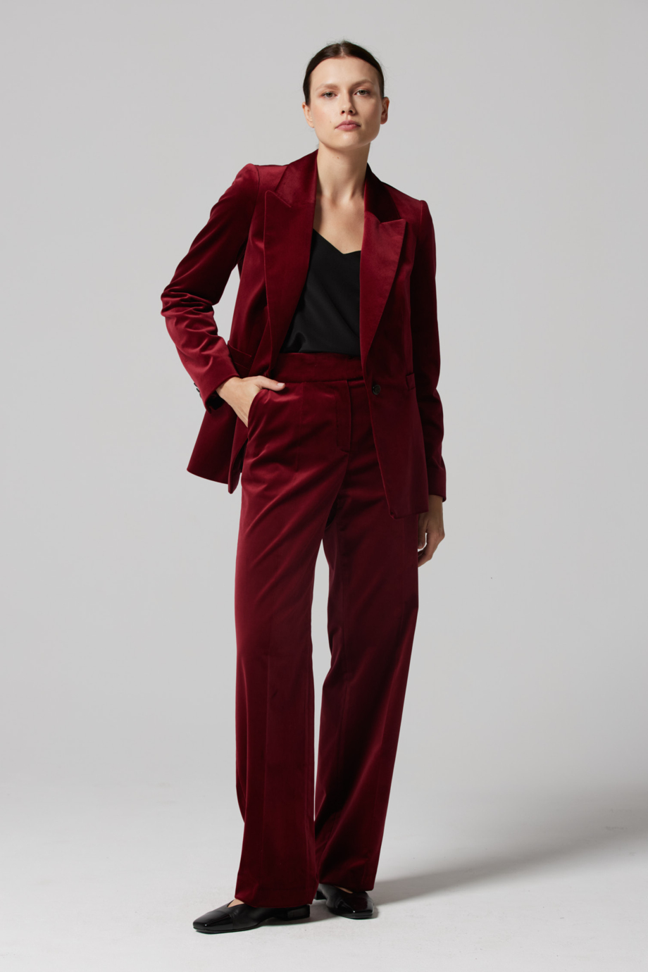 Aksamitne spodnie damskie Patrizia Aryton mają odcień ciemnej czerwieni. Faktura materiału sprawia, że w zależności od kąta padania światła na dane miejsce ubrania, na zmianę połyskują lub wydają się być matowe. Kolor bordowy świetnie łączy się m.in. z czernią, szarością, bielą i jasnym beżem, więc nasze spodnie bawełniane damskie, eleganckie, pozwalają na realizację rozmaitych koncepcji stylizacyjnych. Do kompletu polecamy żakiet z tej samej tkaniny, również pochodzący z linii Nero.