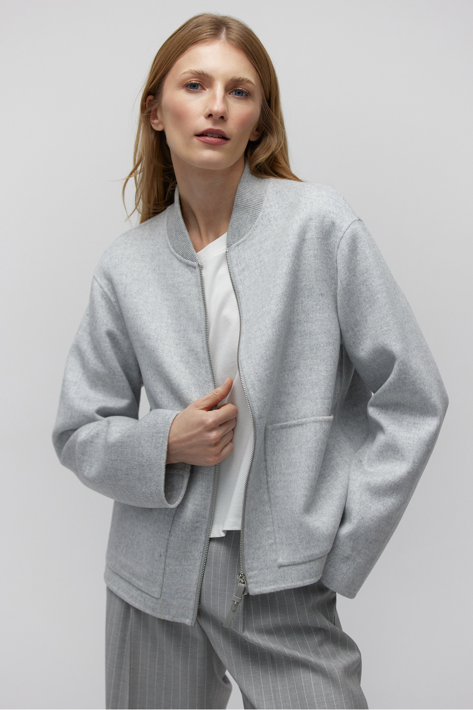 - Szara kurtka doubleface z dodatkiem jedwabiu, o krótkiej formie i długim rękawie