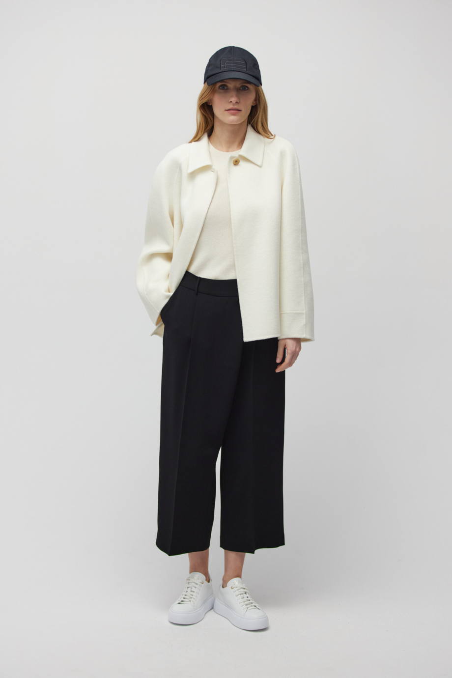 - Kurtka doubleface w kolorze śmietankowej bieli, o krótkiej, luźnej formie z kołnierzem