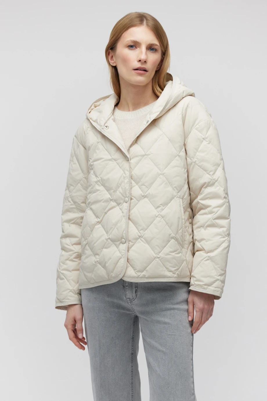 - Krótka kurtka z kapturem w chłodnym odcieniu beżu, z naturalnym puchowym wypełnieniem