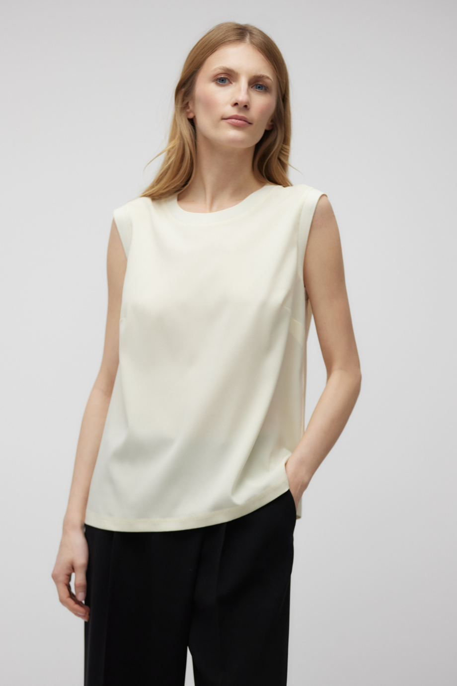 Ta luźna bluzka bez rękawów ma prostą i swobodną formę. Minimalistyczny krój urozmaicają jedynie wykończenia krawędzi materiału przy okrągłym dekolcie i na ramionach. Jej fason będzie odpowiedni na każde okoliczności - cechuje go wyrafinowana powściągliwość przy jednoczesnej efektowności i ekskluzywności jedwabnej tkaniny. Model nie wymaga uzupełniania biżuterią, ale w stylizacjach wieczorowych świetnie będzie się prezentował np. wraz z długim naszyjnikiem.