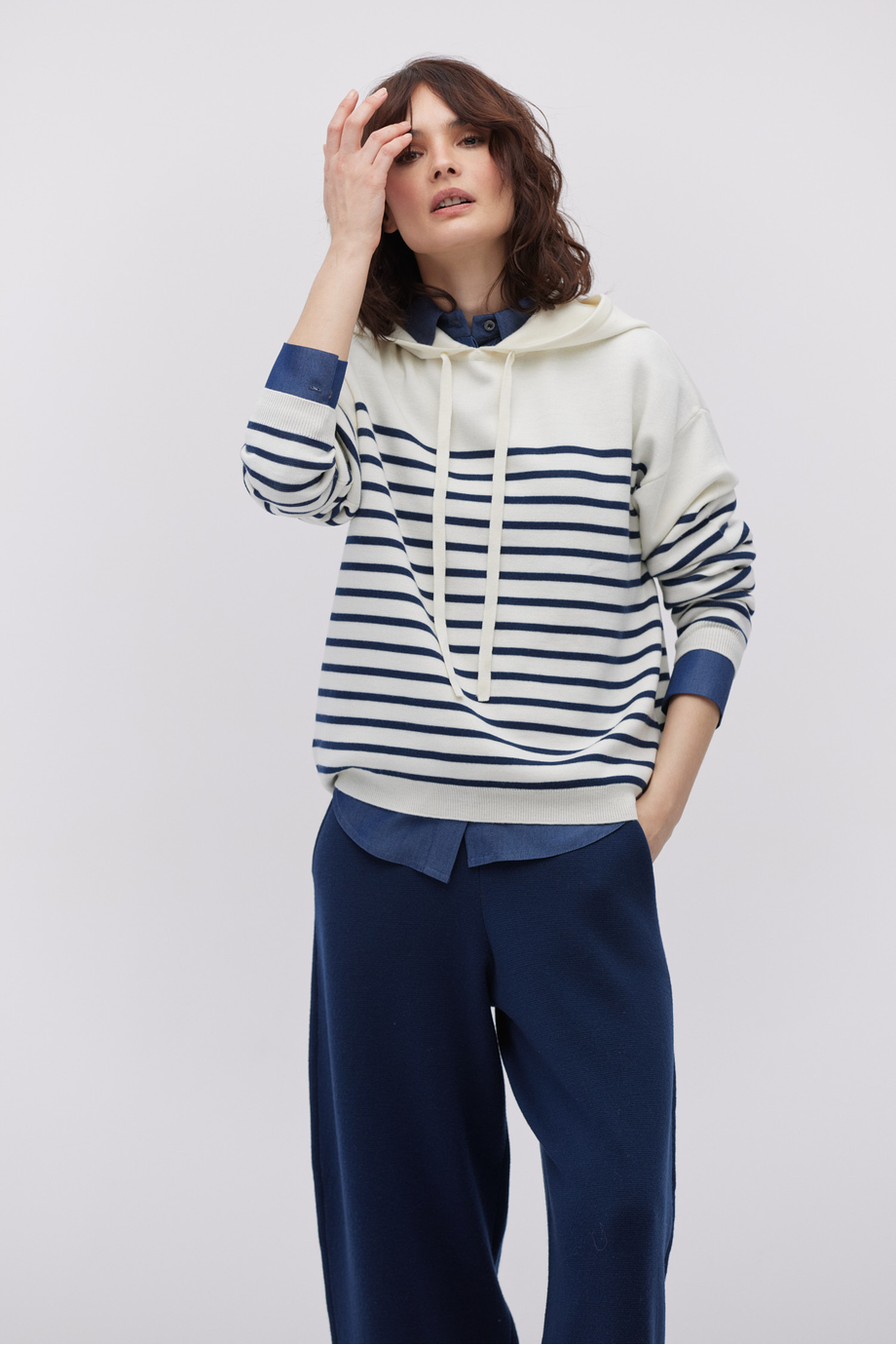 Bluza z kapturem w paski Patrizia Aryton to nowoczesna interpretacja tradycyjnego sportowego fasonu. Wykonana z wełny merynosowej, w marynistyczny deseń w palecie śmietany i granatu jest komfortowa, ale daleka od sportowego banału. Dzięki dopracowanym proporcjom i subtelnym detalom z łatwością odnajduje się w estetyce wyrafinowanego stylu smart casual.