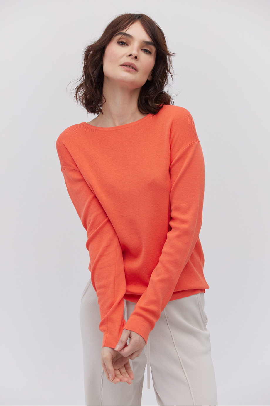 Basicowa bluzka z okrągłym dekoltem nadaje się do łączenia zarówno z jeansami i spodniami dzianinowymi, jak i eleganckimi cygaretkami lub modelami z szeroką nogawką. Stworzy też zgrane duety z casualowymi i smart casualowymi spódnicami. Barwa koralowa należy do głównych motywów sezonu wiosna-lato 2025 i dobrze harmonizuje szczególnie ze stonowanymi, ziemistymi kolorami, np. chłodnymi beżami, cieplejszymi szarościami, śmietaną i zgaszonym brązem.