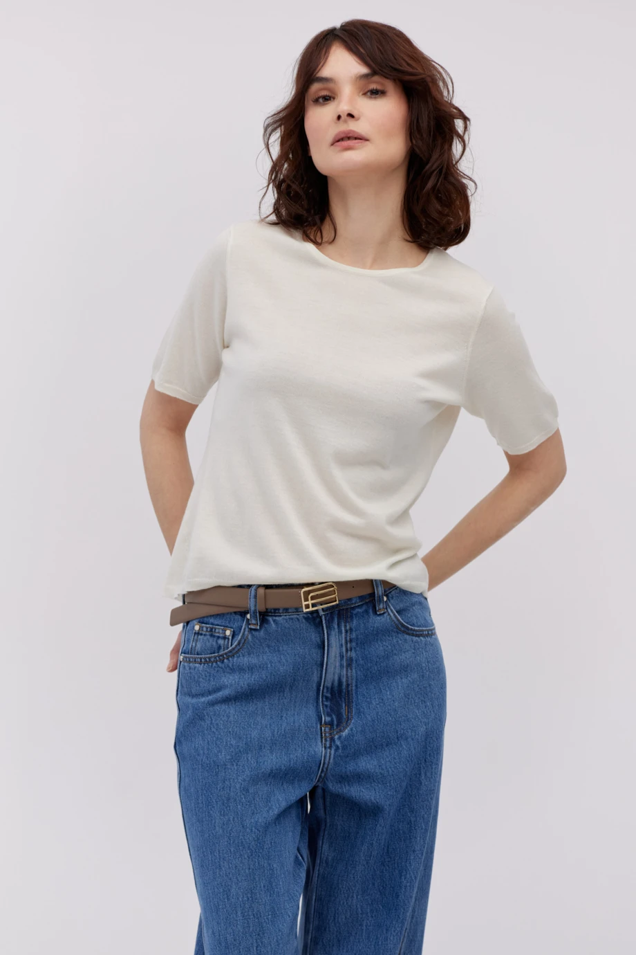 Czy dzianinowy t-shirt może być ekskluzywny? Nasza śmietankowa bluzka z kaszmirem udowadnia, że tak! Jeśli potrzebujesz bardziej niezobowiązującej bazy do biurowych żakietów i cygaretek, ale też codziennych outfitów z jeansami i joggerami, postaw na ten wygodny, szykowny model, który swoją wszechstronnością wygrywa z tradycyjnymi koszulkami. Odkryj, dlaczego zwykła-niezwykła biała bluzka z krótkim rękawem Patrizia Aryton jest w stanie skraść Twoje serce!