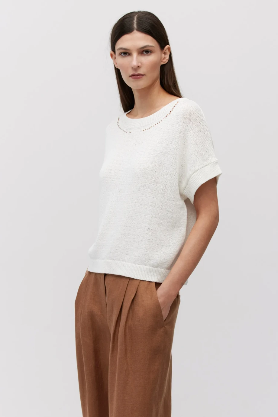 - Prosty krój, krótki rękaw i miękka luźna dzianina o splocie plain knit