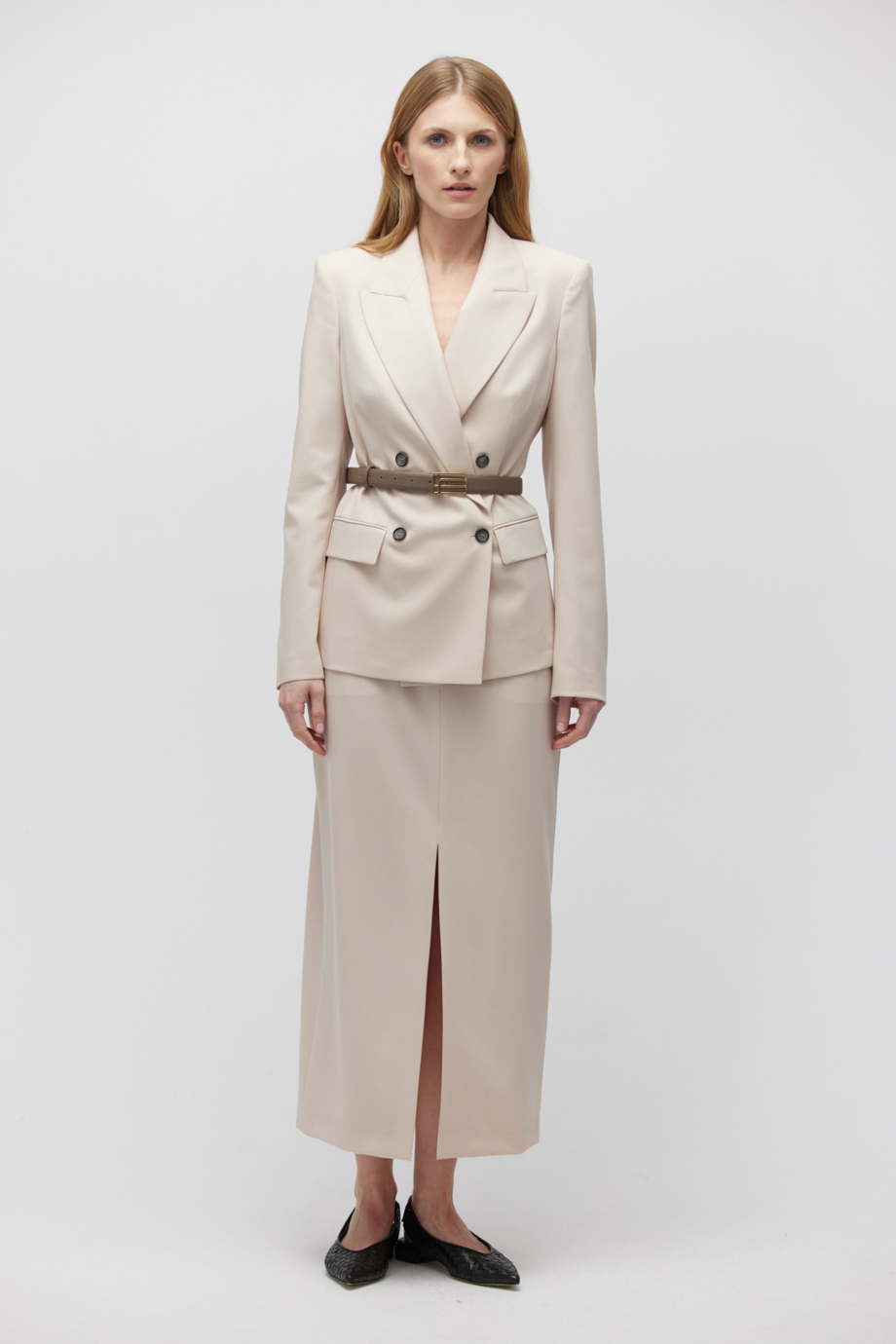 - Wełniana spódnica midi w kolorze nude.