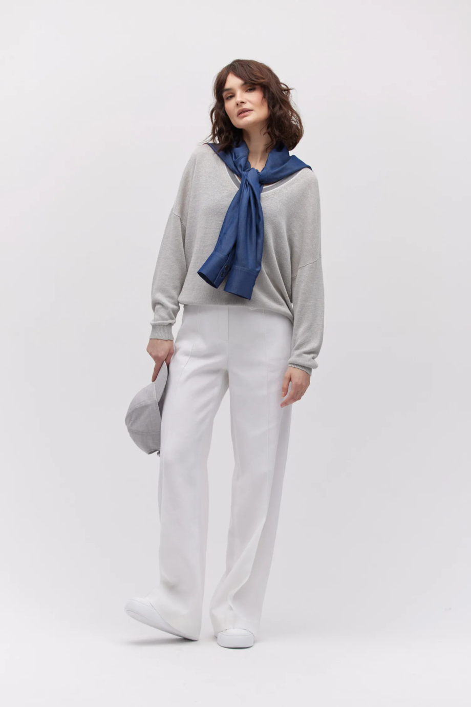 - Białe spodnie z bawełny i lnu o prostym, szerszym kroju z kantem