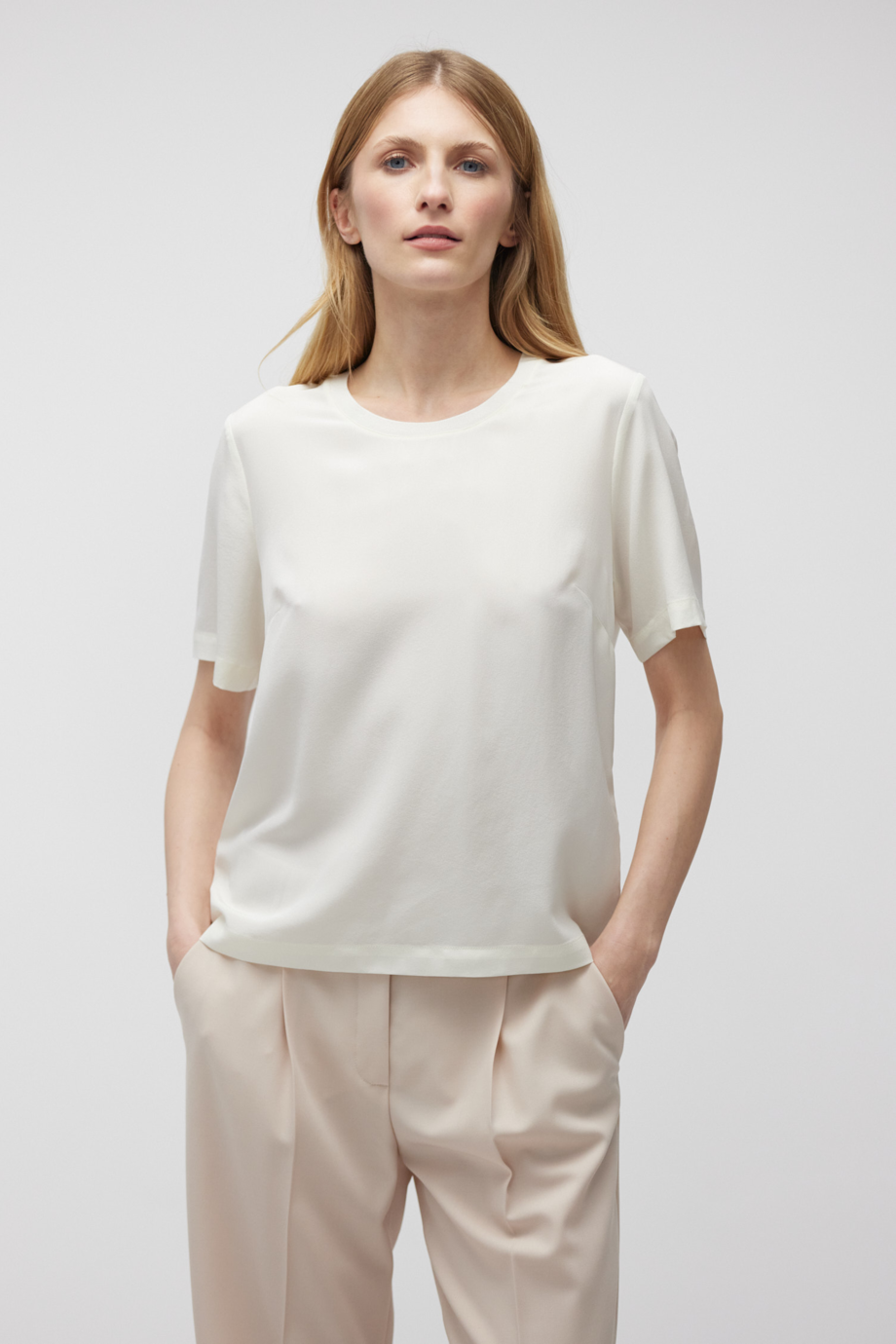 Śmietankowy odcień bluzki podkreśla jej klasyczny charakter, dodając świeżości i blasku każdej stylizacji. Prosta bluzka z okrągłym dekoltem i krótkim rękawem harmonijnie współgra z różnorodnymi elementami garderoby, od eleganckich żakietów po casualowe kardigany. Minimalistyczny design bluzki Brigitte wpisuje się w aktualne trendy, gdzie liczy się jakość, funkcjonalność i subtelna elegancja.