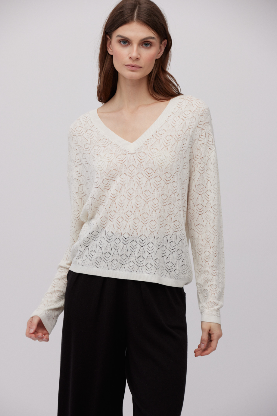 - Bluzka z jedwabiem i kaszmirem, wykonana w splocie open knit, na maszynie o uigleniu 16 GG