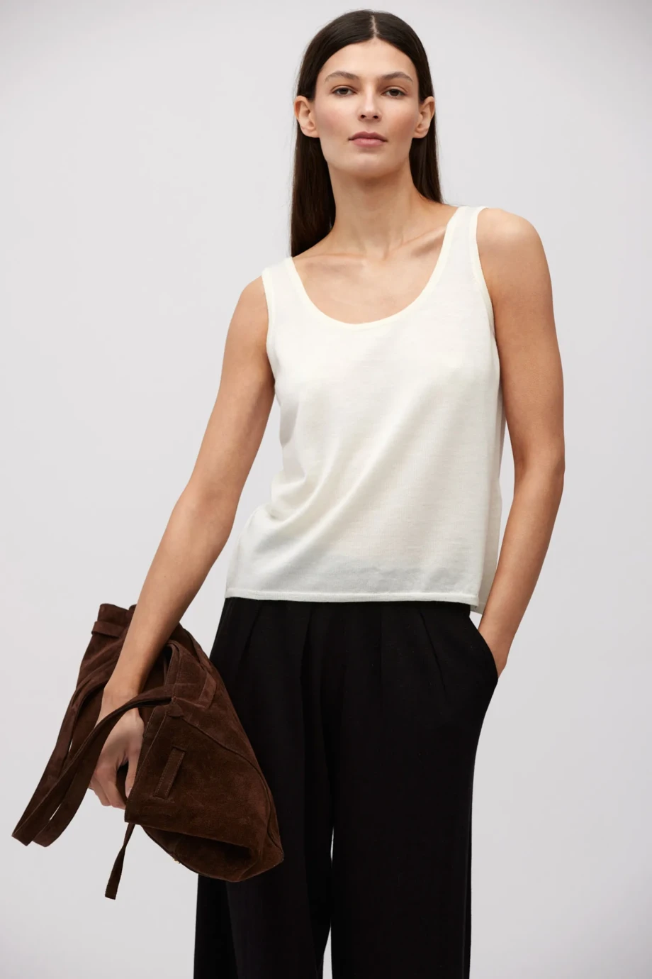 Top z okrągłym dekoltem i prostym, lekko dopasowanym krojem został wykonany z delikatnej dzianiny typu jersey knit na maszynie 16 GG, co gwarantuje wyjątkową miękkość, sprężystość i subtelny wygląd. Dzianinowy top na ramiączkach to must have tego sezonu - lekki, wygodny, a zarazem niezwykle stylowy. Świetnie prezentuje się samodzielnie lub jako warstwa pod żakiet czy kardigan, wpisując się w nowoczesne podejście do stylizacji warstwowych.