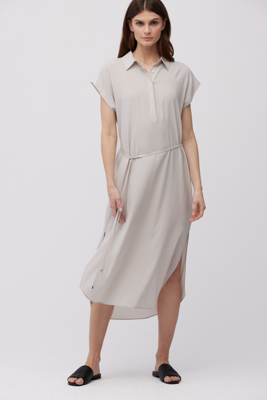 - Beżowa sukienka koszulowa midi z jedwabiu, dostępna w dwóch kolorach